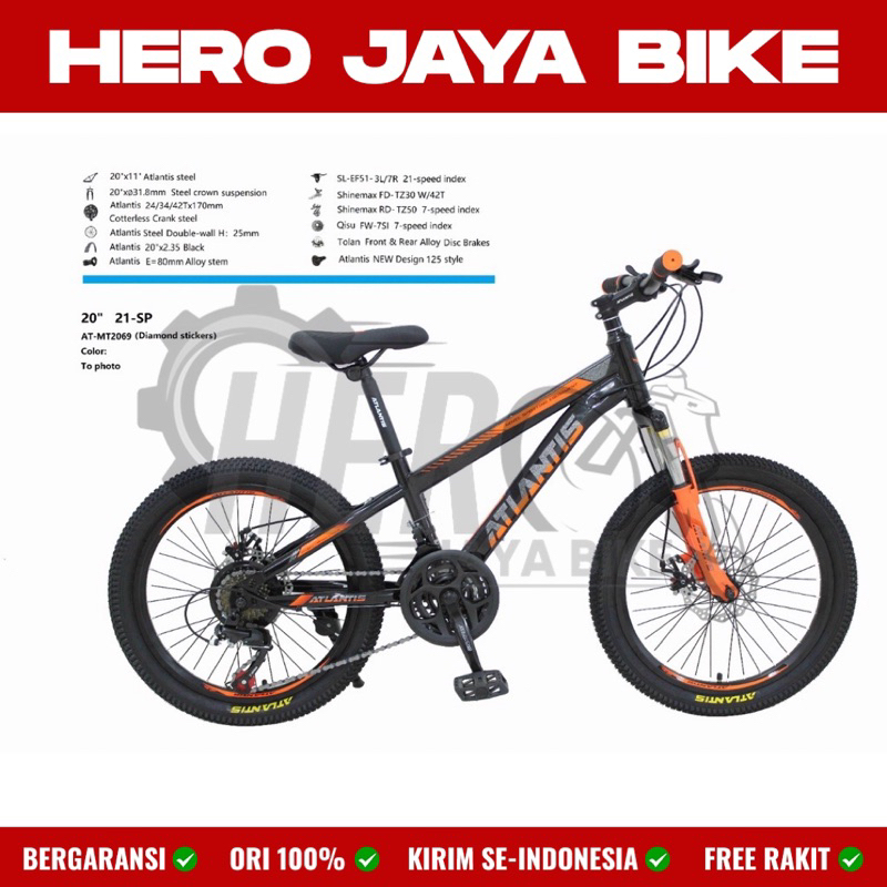 Sepeda MTB ATLANTIS 20Inch MT-2069 Rem Cakram 21 Speed Usia 8-12 Tahun Operan Gigi