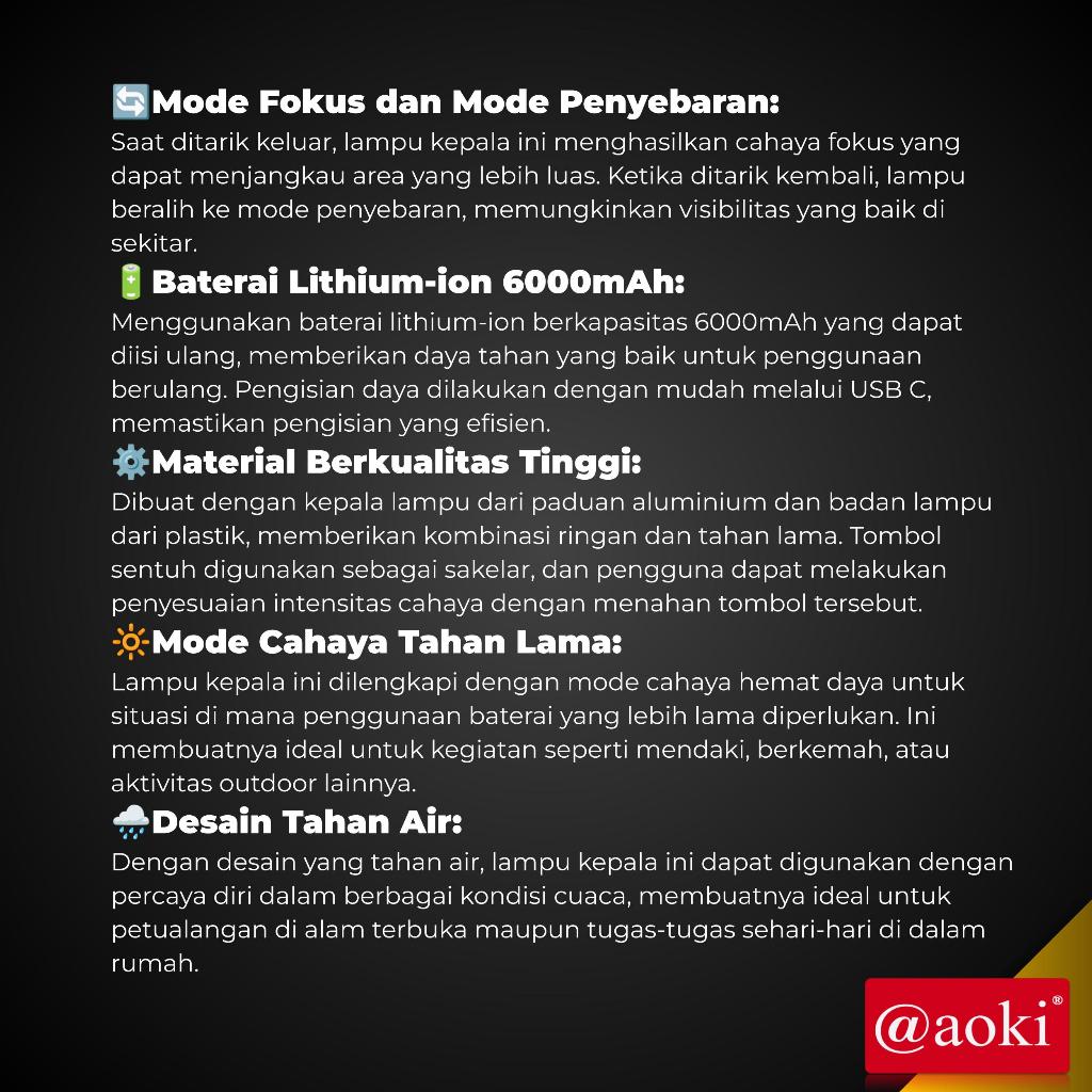 AOKI Senter Kepala Cahaya Maksimal Plus RechargePro USB-C, 80W 1300lumen 1500lumen Penyebaran Zoom