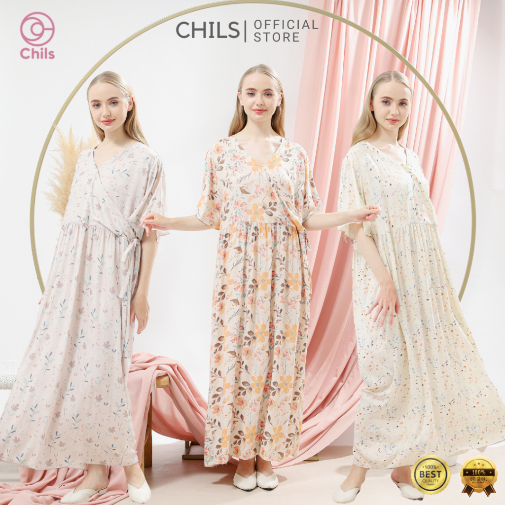 Chils Daster Kimono V-Neck Motif Elegan baju busui daster rayon premium Panjang kekinian Terbaru