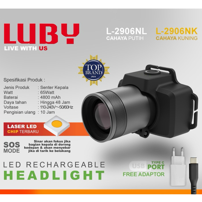SENTER KEPALA ZOOM LASER LED 65W LUBY L-2906NL - SUPER TERANG - JARAK JAUH - TAHAN LAMA - TYPE-C