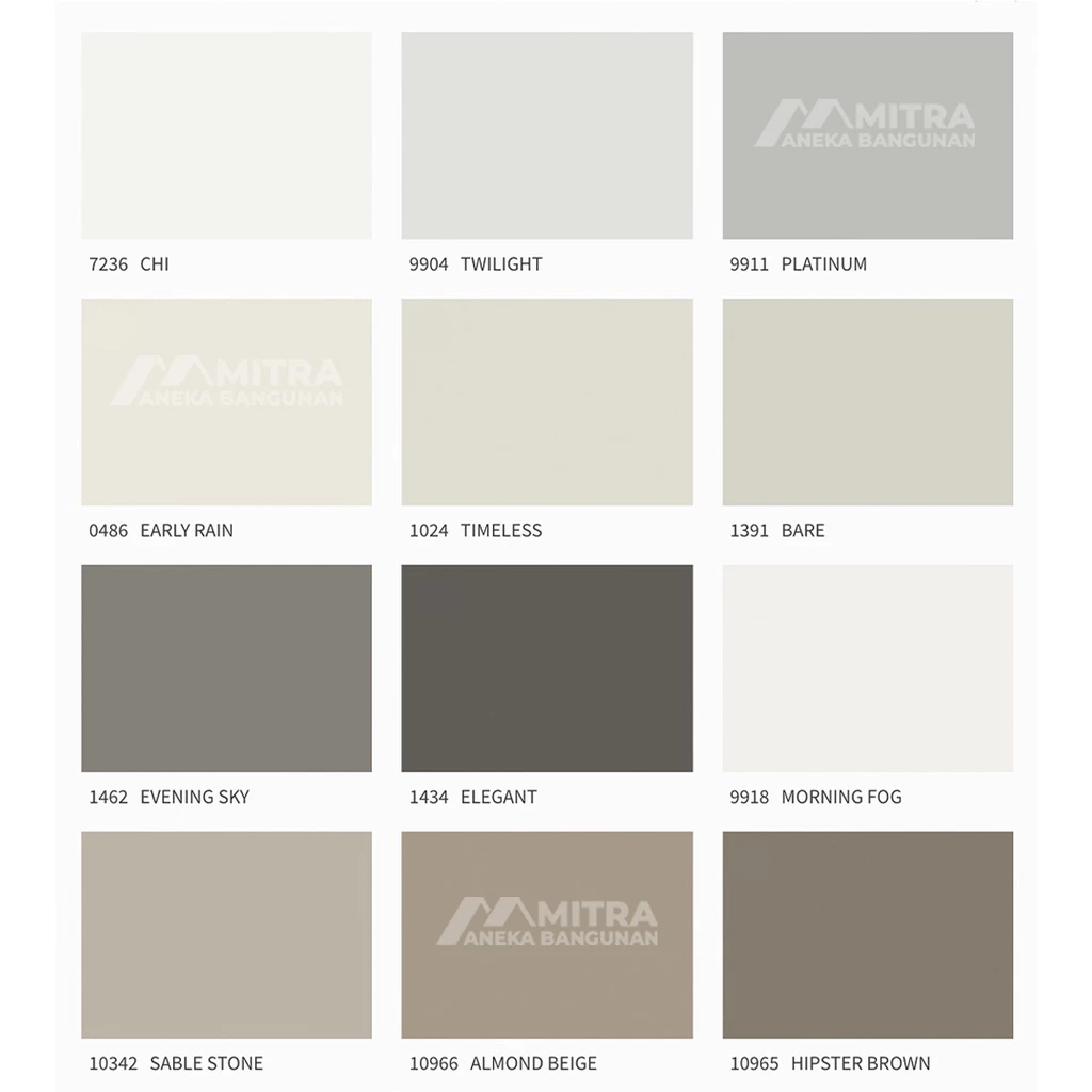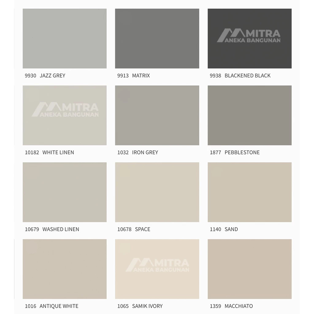 WHITE / PUTIH, CHI 7236, TWILIGHT 9904, PLATINUM 9911, EARLY RAIN 0486, TIMELESS 1024, BARE 1391, EVENING SKY 1462, ELEGANT 1434, MORNING FOG 9918, SABLE STONE 10342, ALMOND BEIGE 10966, HIPSTER BROWN 10965, JAZZ GREY 9930, MATRIX 9913, BLACKENED BLACK 9938, WHITE LINEN 10182, IRON GREY 1032, 1877 PEBBLESTONE, WASHED LINEN 10679, SPACE 10678, SAND 1140, ANTIQUE WHITE 1016, SAMIK IVORY 1065, MACCHIATO 1359, PERSIAN KHAKI 1623