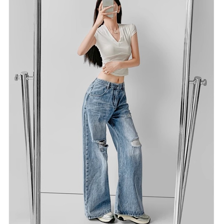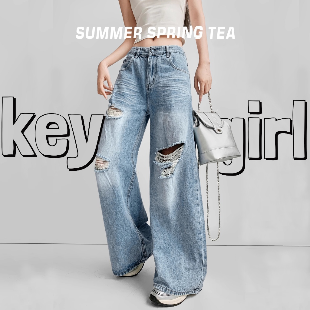 Keygirl New Biru Robek Highwaist Celana Panjang Jeans Wanita jumbo size 5XL jeans original Premium
