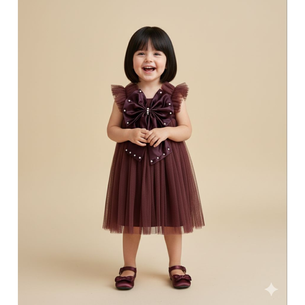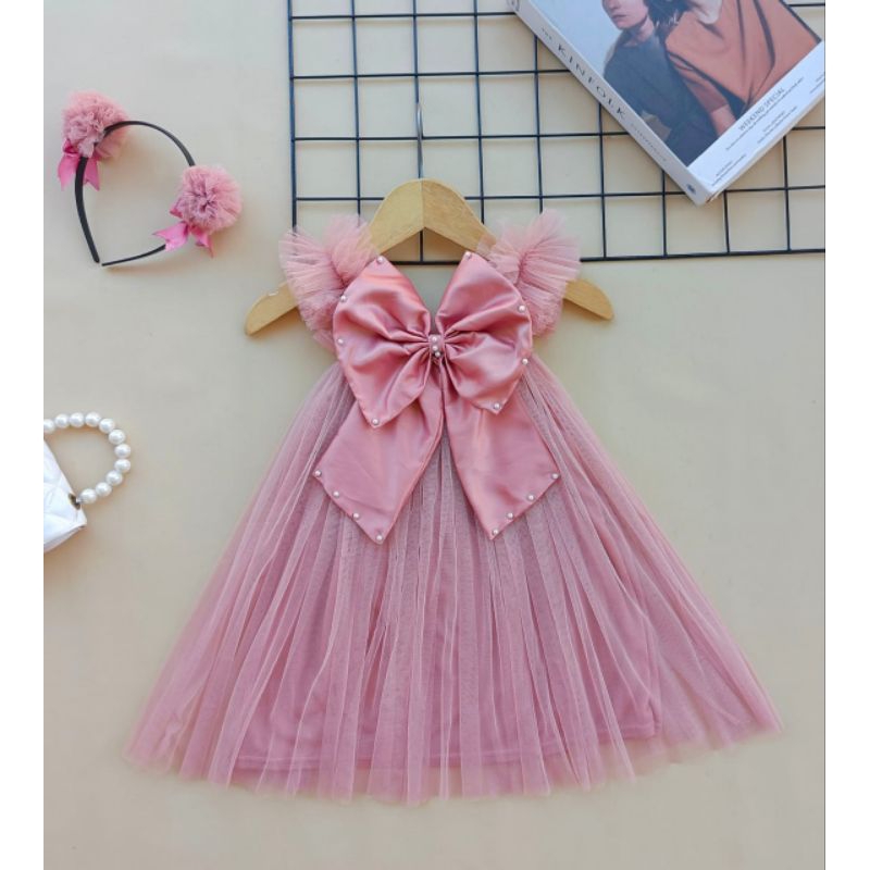 [READY STOCK] Dress pesta tutu tile anak dan bayi burgundy mutiara mewah bigbow pita satin besar pink denim blue jeans m