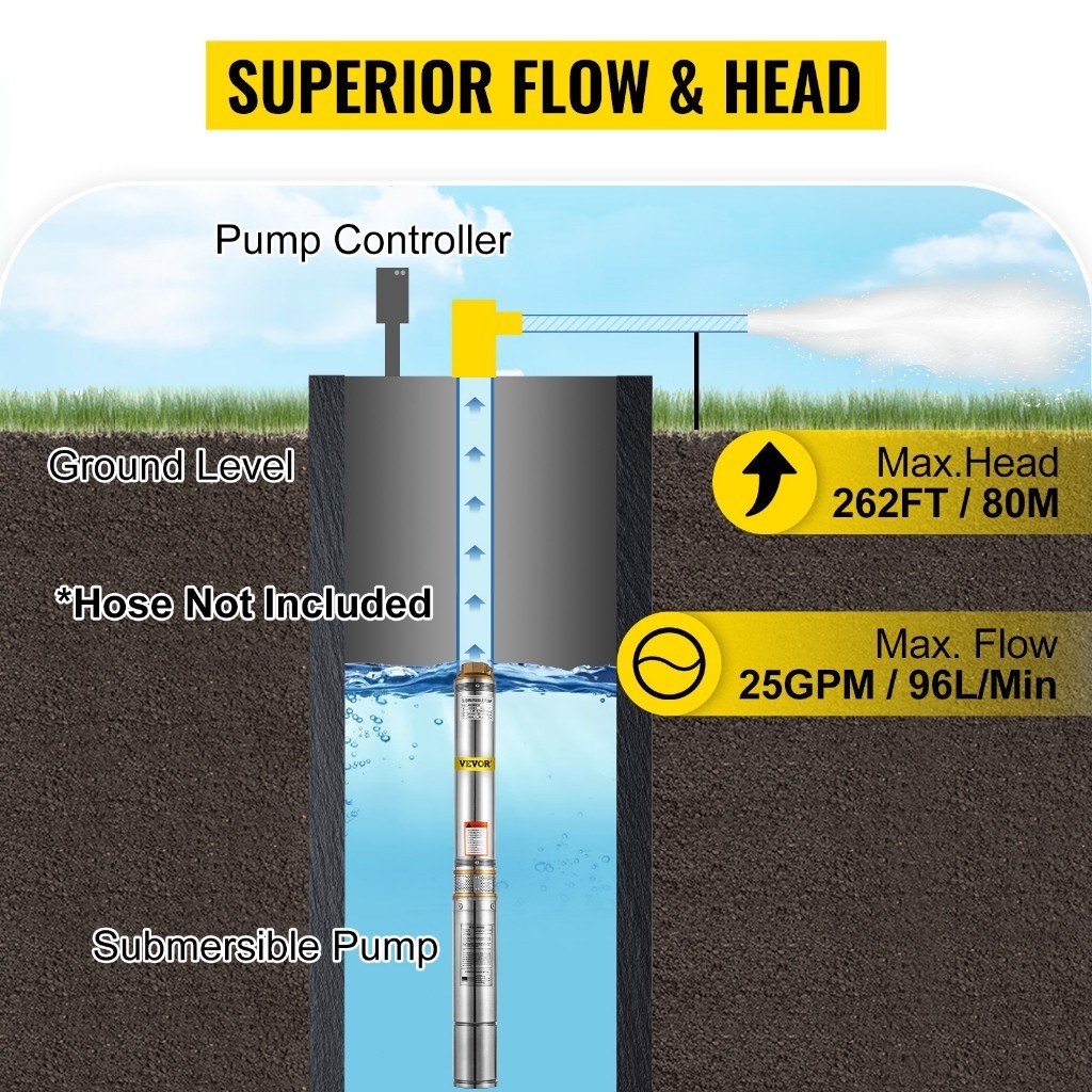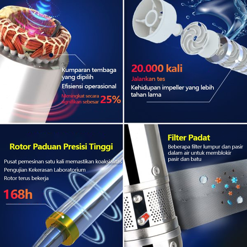 DEKES Pompa Satelit 370W 0.5HP Sawah Kebun Pompa Submersible 3 inch Kabel 15M Stainless Steel Submersible Pump Daya His
