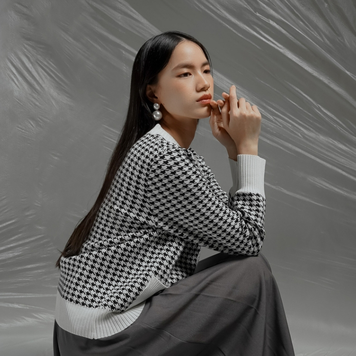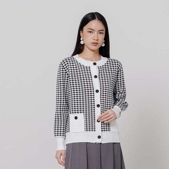 This Is April Atasan Cardigan Knit Wanita Emory Houndstooth Pattern Black Knit Cardigan 60008700
