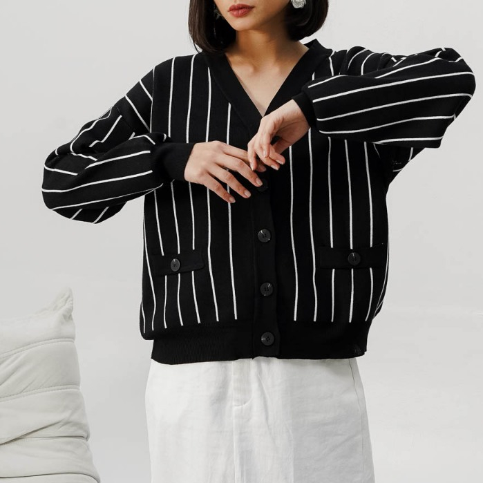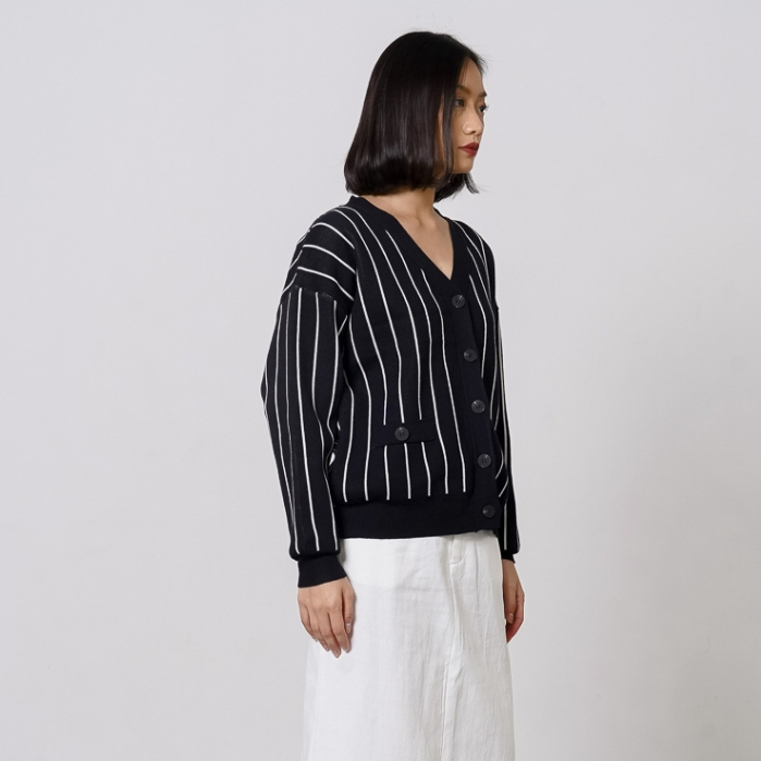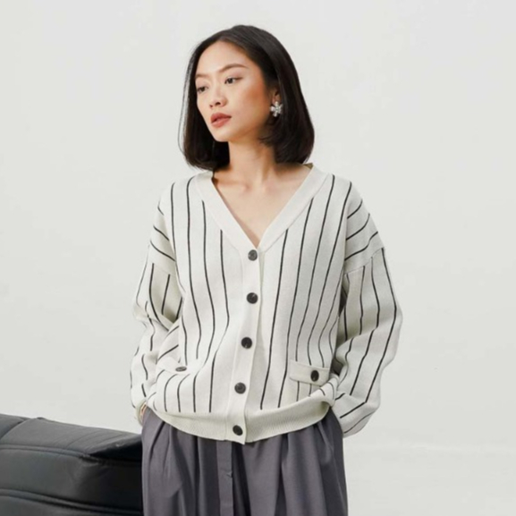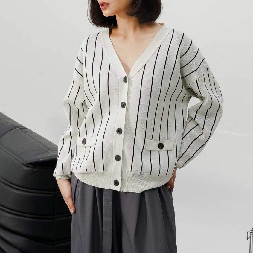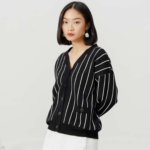 This Is April Baju Atasan Wanita Terbaru Stripe Rajut Oversized Lengan Panjang Oslo Cardigan Black dan Ivory