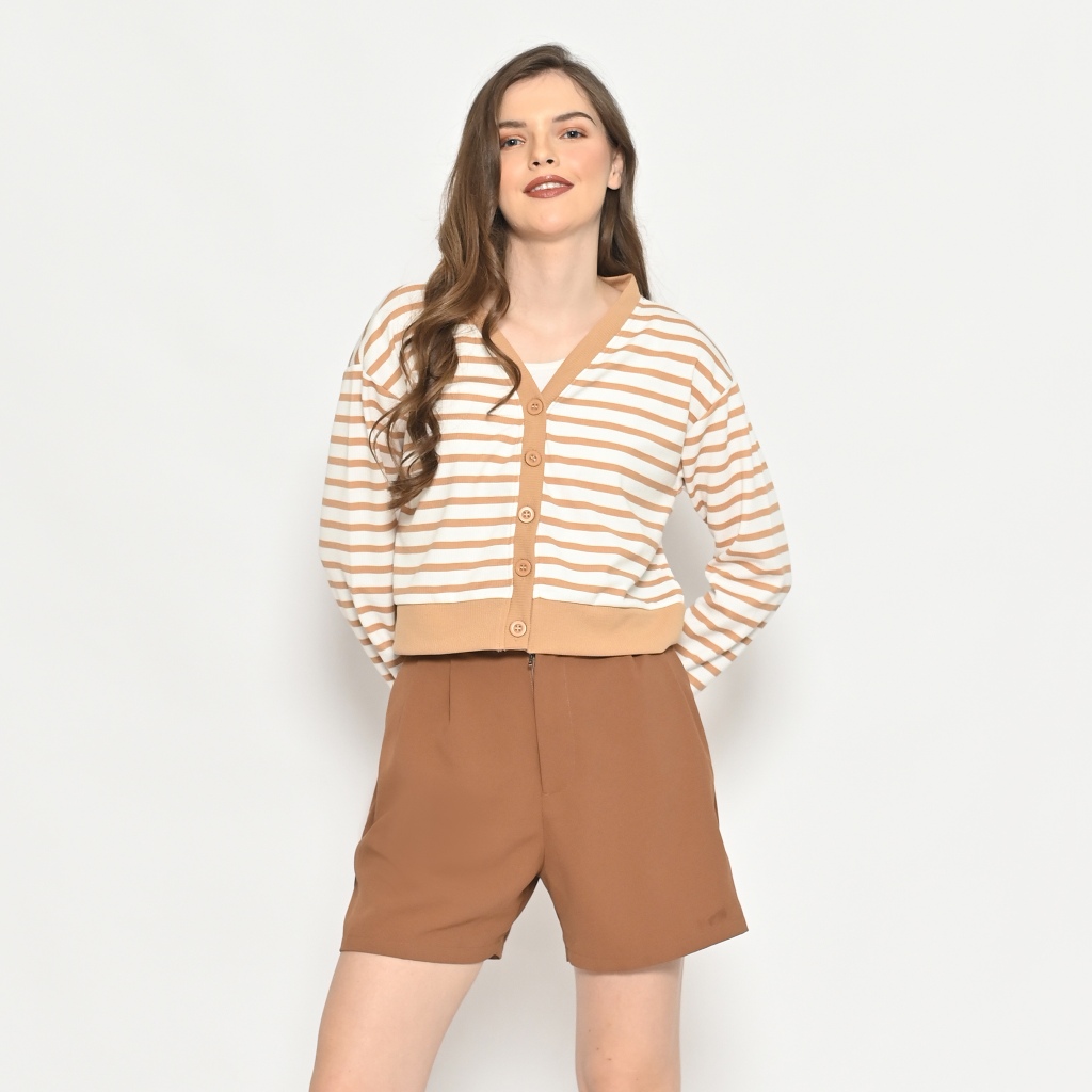 QUEENTIN Cardigan Wanita Crop 0891 Stretch Caramel Knit Motif Salur Lengan Panjang