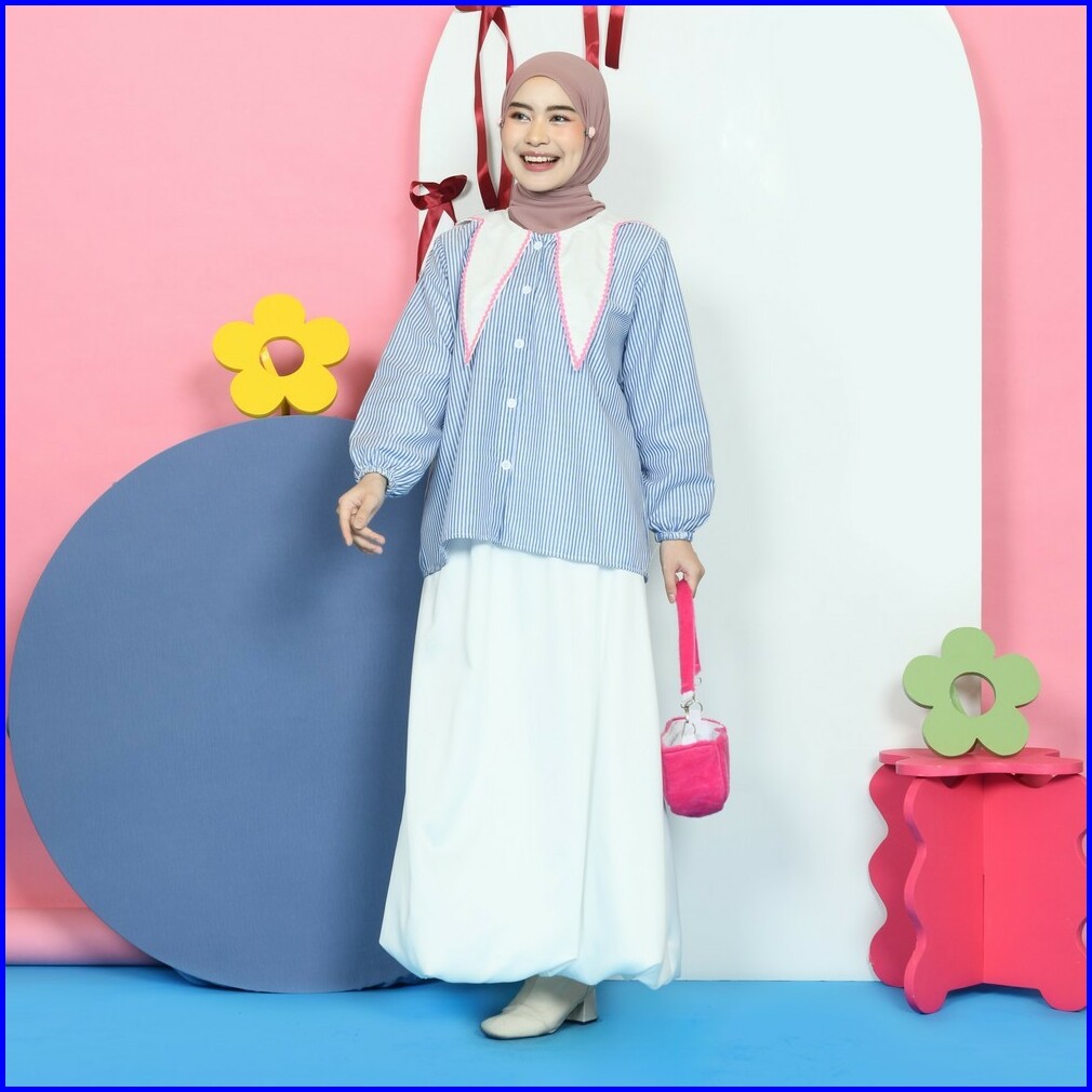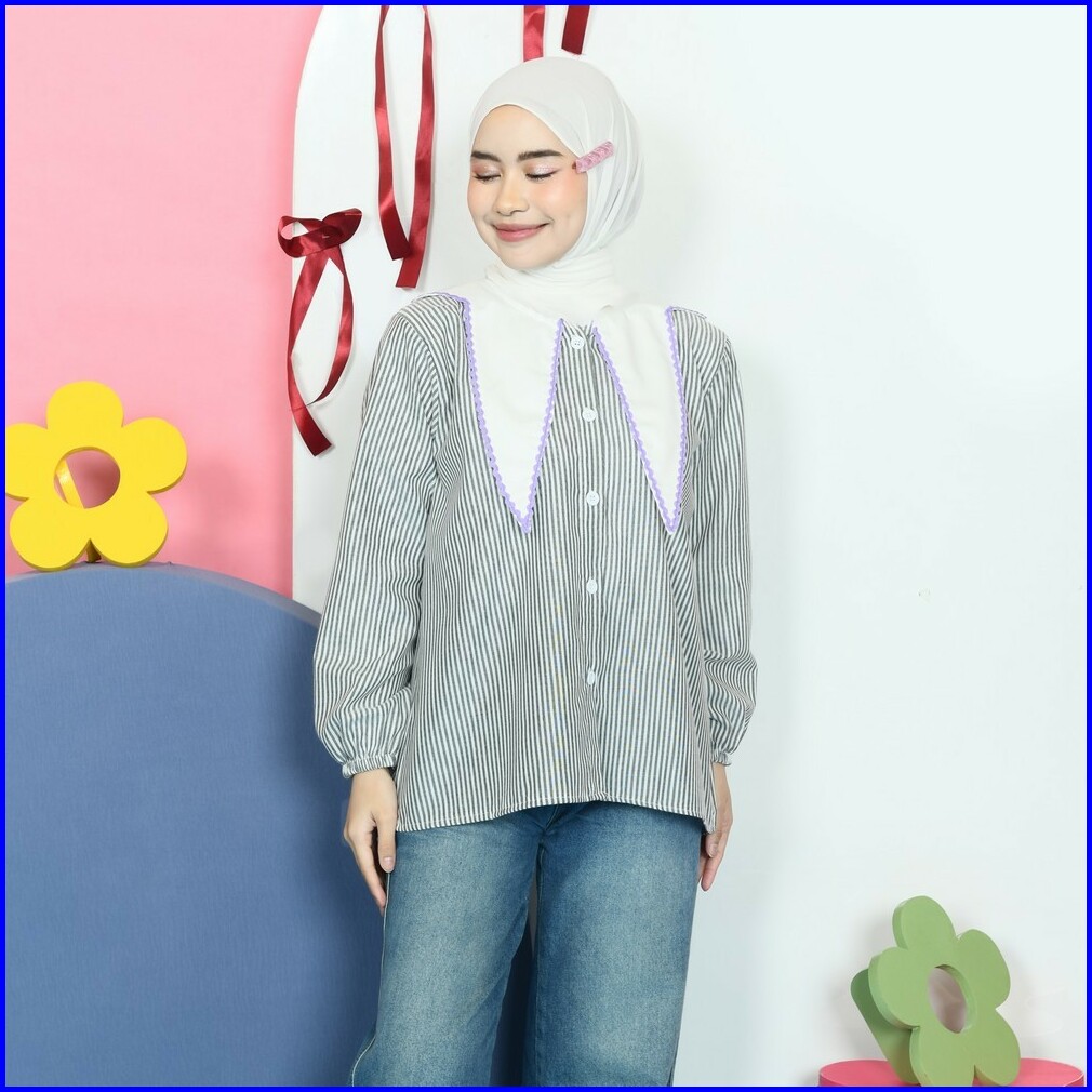 Mybamus Bunny Kemeja Stripe Atasan Garis Kekinian Variasi Kerah Renda Zigzag Stripe