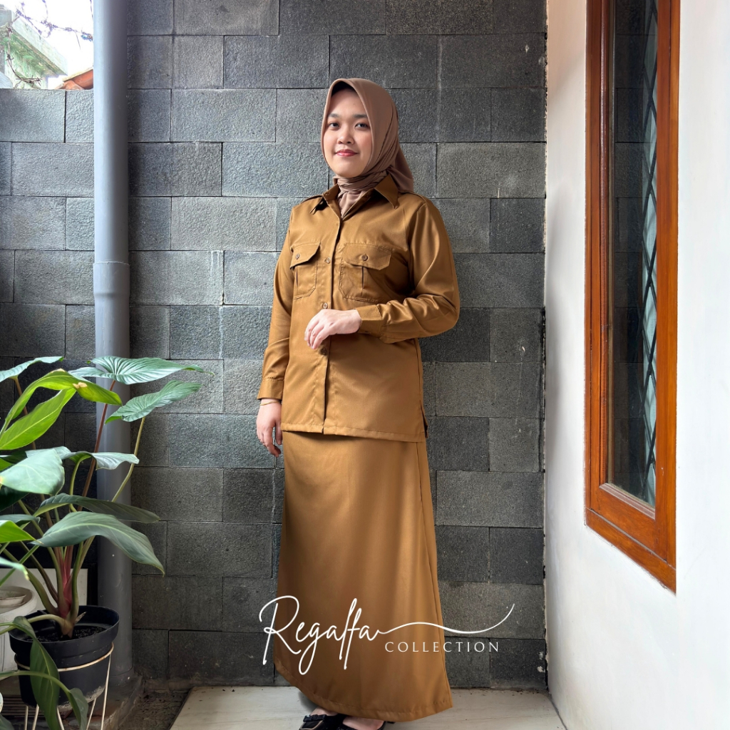Setelan Baju Kemeja Pemda Dinas PDH PNS Wanita Model Saku Dada Warna Khaki Tua Terpopuler
