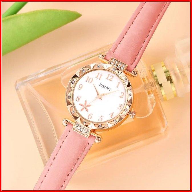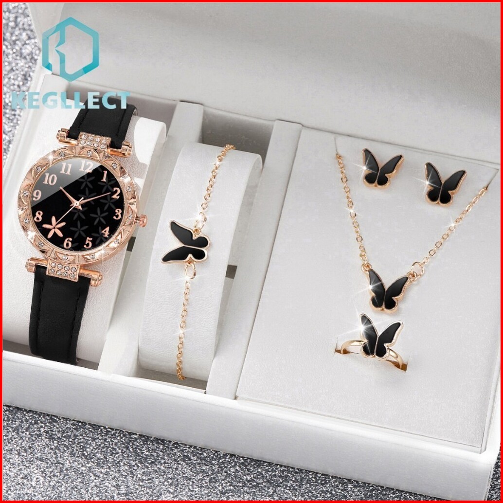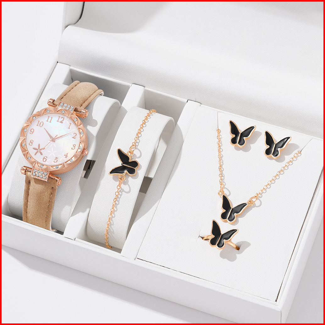 5 Pcs Jam Tangan Kuarsa Wanita Tali Silikon Dial Bulat Dengan Set Hadiah Gelang Manik-manik