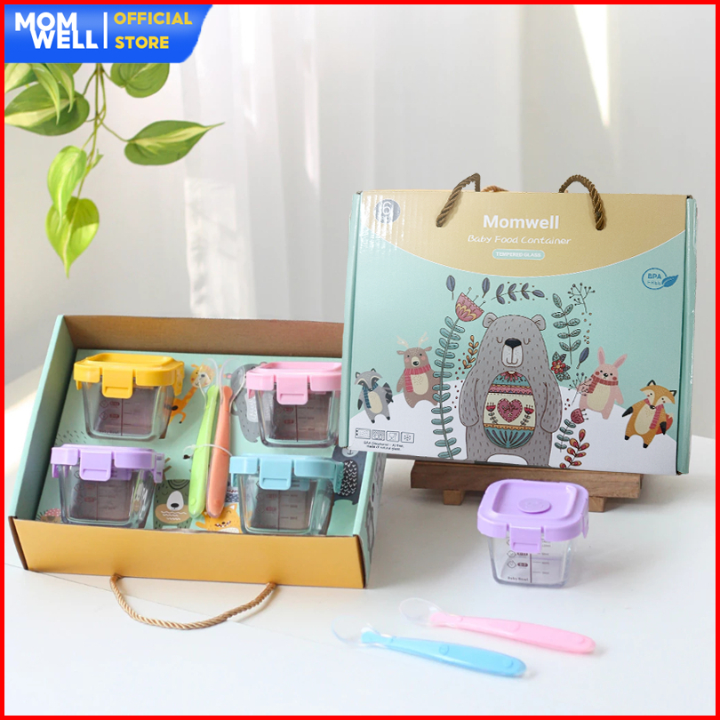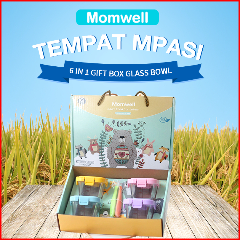 Momwell 6 In 1 Tempat Mpasi Kaca Hampers Baby Gift Set Wadah Mpasi Kado Lahiran Bayi Sendok Gfb10