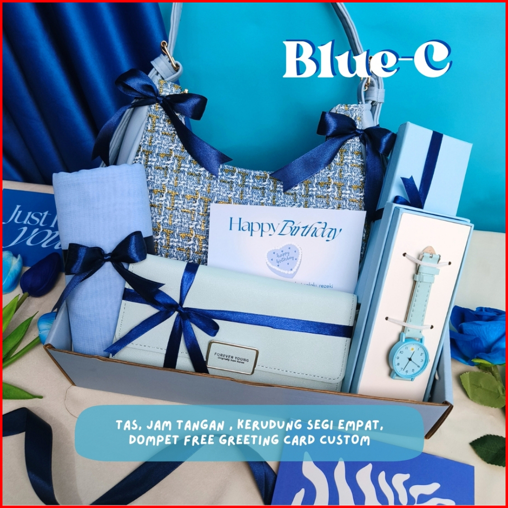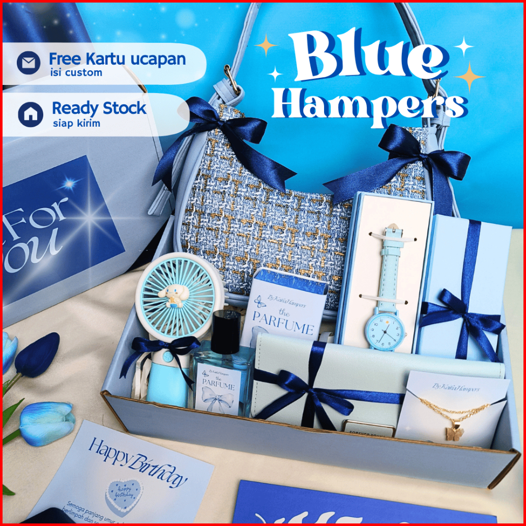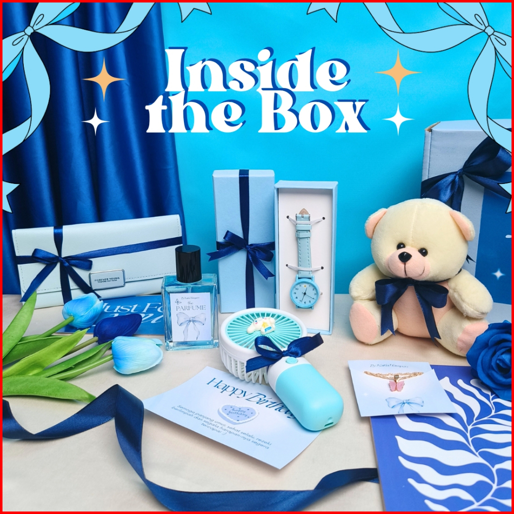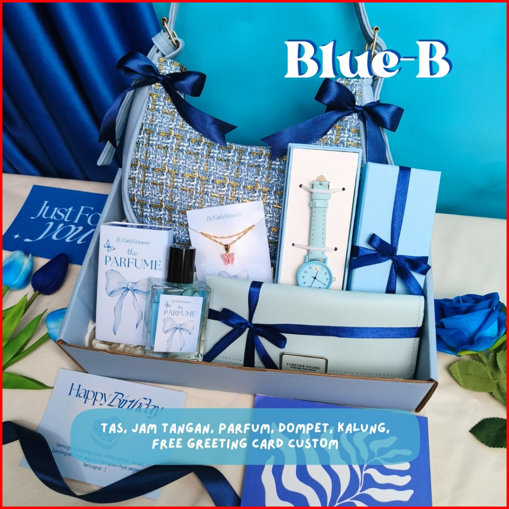 Hampers Gift Box Tas Biru Kado Cewek Hadiah Pacar Pink Tas Parfum Dompet Kalung Kado Ulang Tahun Ultah Anniv