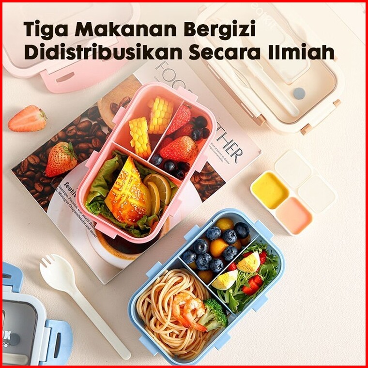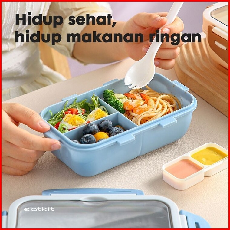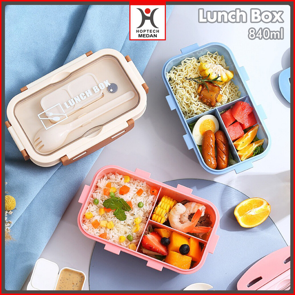 Hoptech - Set Kotak Makan Siang 840ml Desain Kompartemen Lunch Box Microwave Gratis Alat Makan Box Saus Medan Ready Stoc