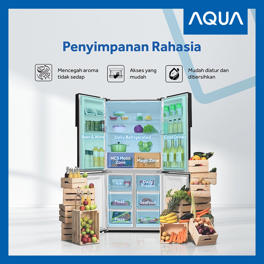 Aqua Kulkas 4 Pintu 469L Aqr-Ttd546Rbv(Mx) Twin Inverter Multi Door Refrigerator Magic Zone H-Deo Hcs Moist Zone Kulkas