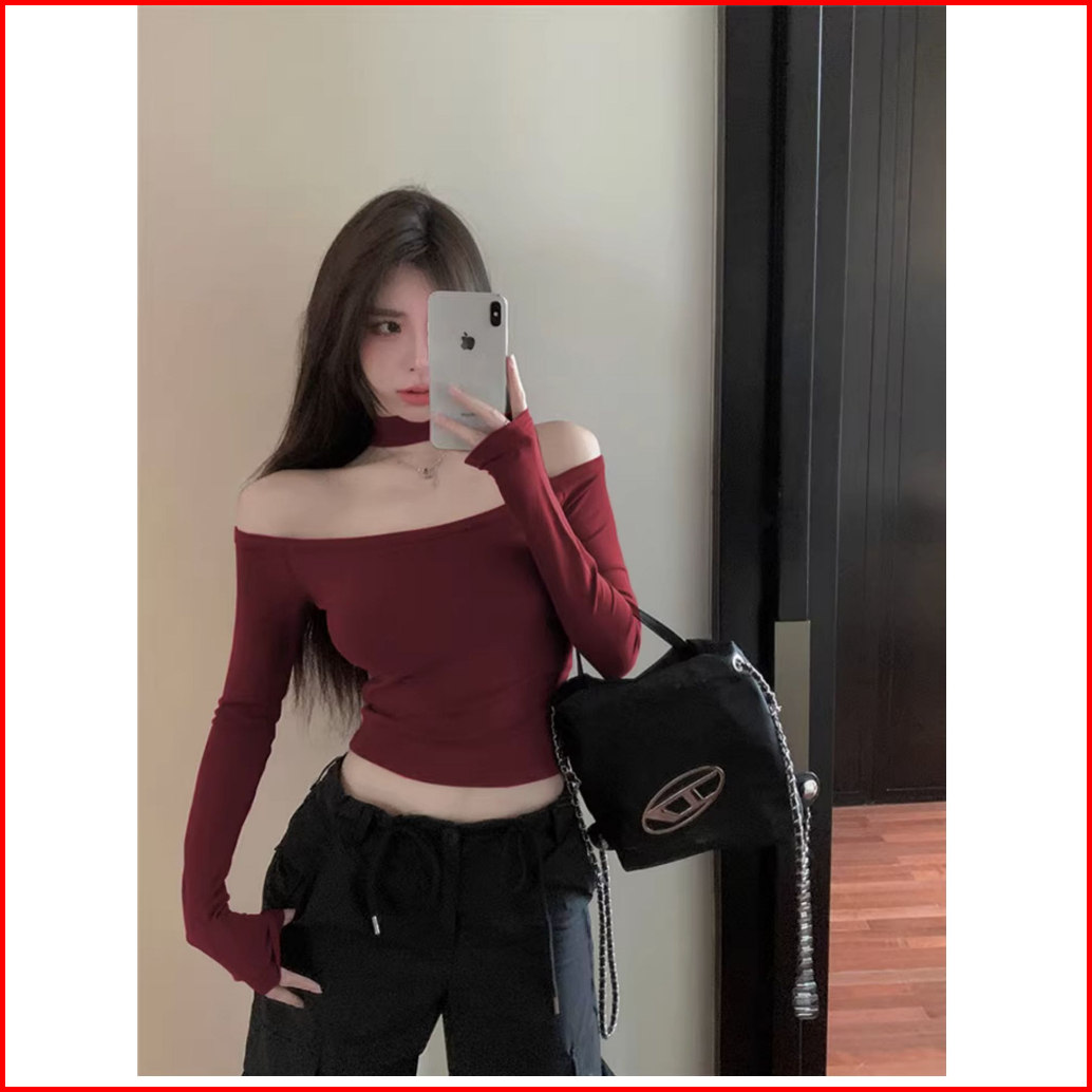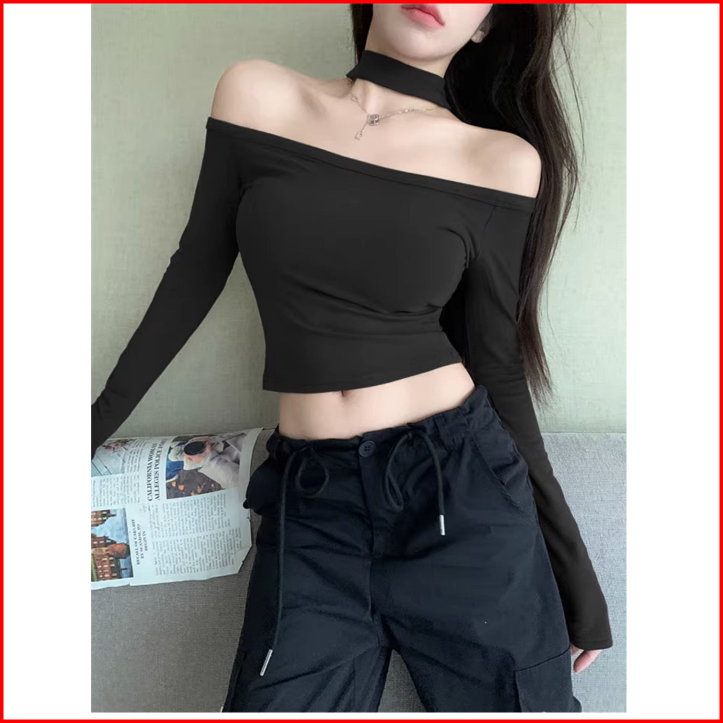 Cohan Ds028 Baju Fashion Women S Slimbody Square Neck Long Sleeve Crop Top Merah Hitam S M L