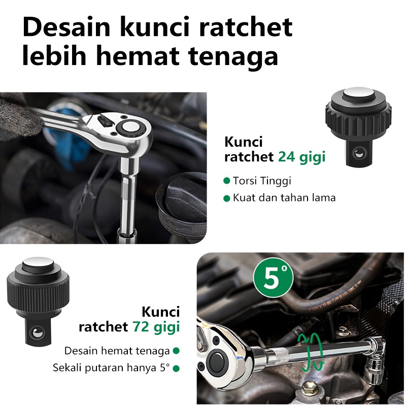 ISKU Kunci Sok Set 51pcs 24Gigi/72Gigi Gagang Rachet Tool Kit Set/Termasuk 9pcs Kunci Ring Pas Set 8-19mm Dan 19pcs 1/2