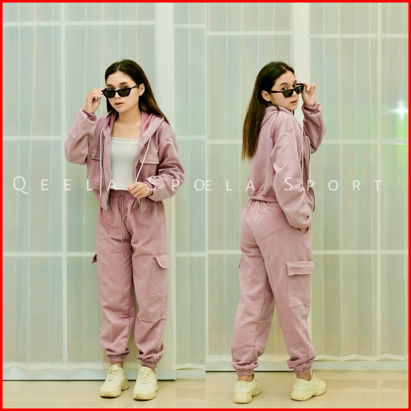 Setelan Crop One Set Wanita Hoodie Zipper X Jogger Cargo Sweatpants Oneset Ootd Korean Style Viral