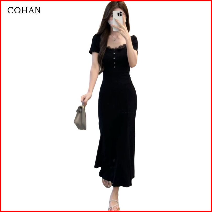 Cohan Dr8056 Maxi Dress Korean Short Sleeve Full Body Black Polos S M L Xl