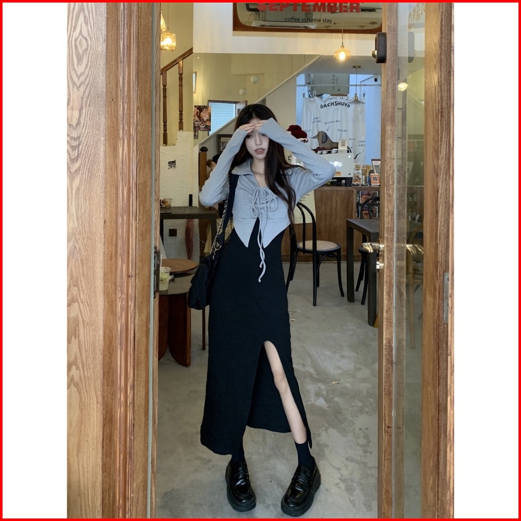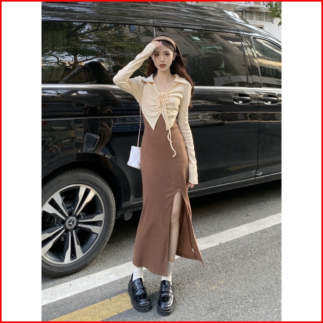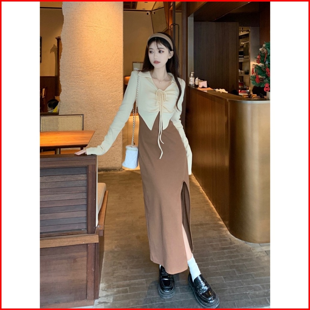 Cohan Dr119 Dress Lengan Panjang Korean Style V-neck Tali Full Body Black Brown S M L Xl 2xl