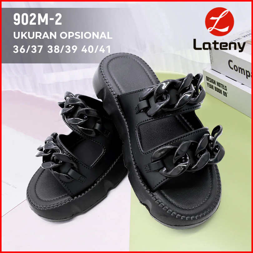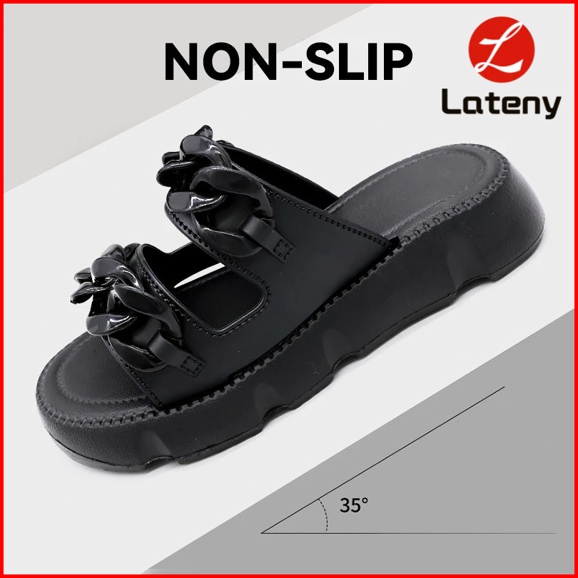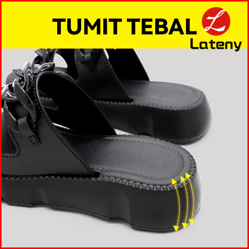 Lateny Sandal Wanita Wedges Karet Jelly Sol Tebal Tali Rantai Hitam