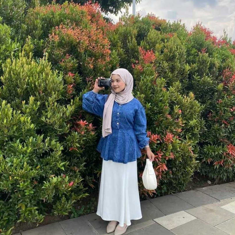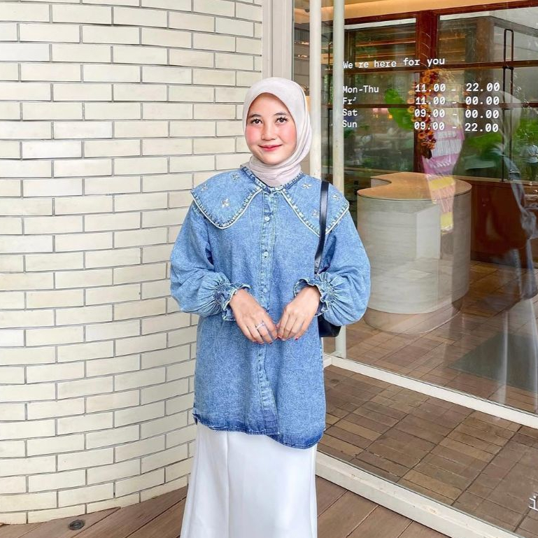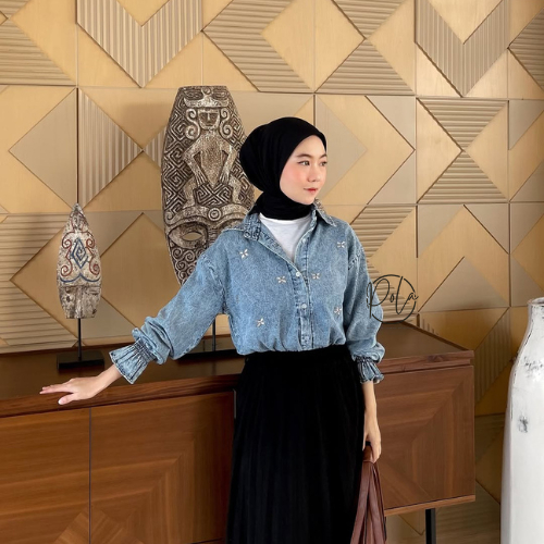 Pola Wear Twyla Kemeja Jeans Wanita Payet Atasan Oversize Denim Lengan Karet