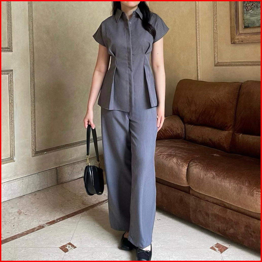 Kemeja Wanita Salur Alba Top Stripe Fitted Shirt Slim Fit Lengan Pendek Casual Kantor Korean Style