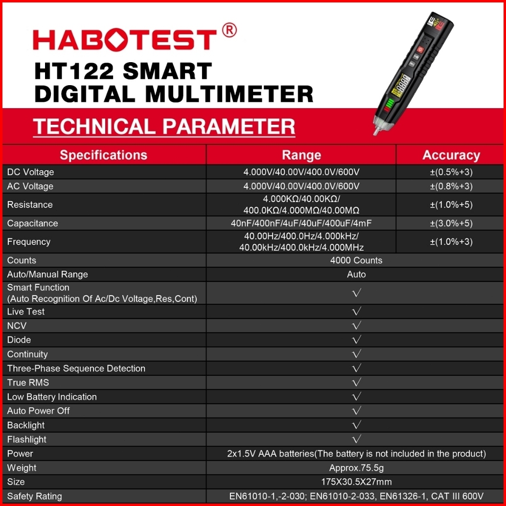 Habotest Pena Uji Digital Dc Ac Multimeter 600v Penguji Tegangan Rms 4000 Hitungan Voltmeter Ncv Detektor Kawat Ht122