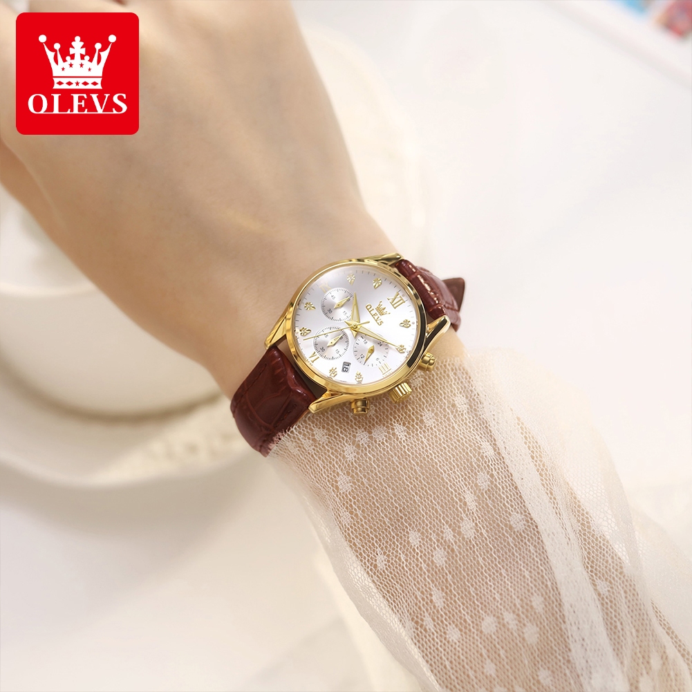 OLEVS Jam Tangan Wanita Anti Air Tali Kulit Original Luxury Bercahaya Kalender Quartz Watch Woman 5523