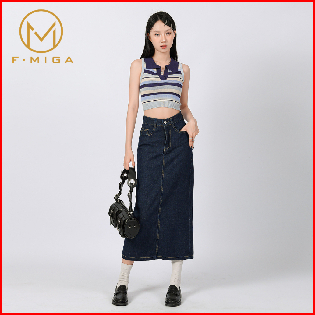 F Miga C123 Korean High Waist A-line 3 4 Denim Rok Jeans Midi Wanita - Biru Tua