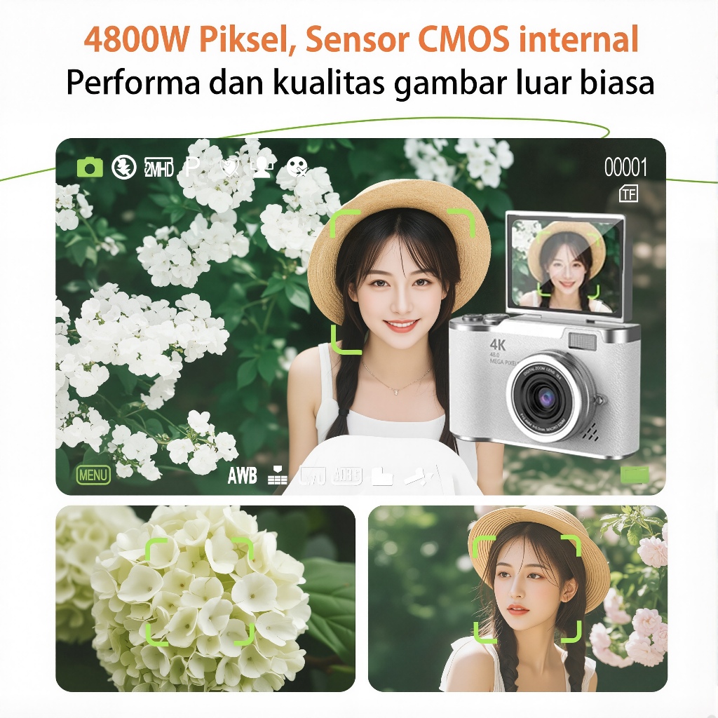 Kamera Digital 48MP 8X Zoom Kamera Digicam Layar Balik 180° LCD 2,4 Inci 4K Vlog Anti Goyang Filter Kamera Pocket untuk