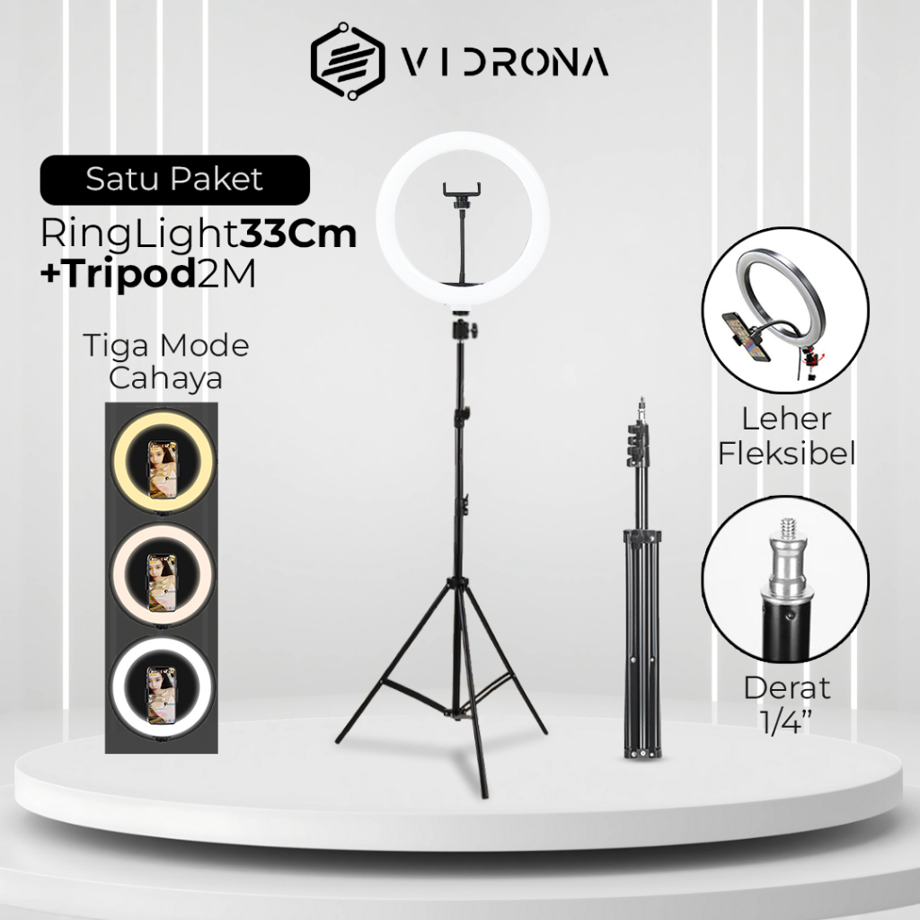 VIDRONA Satu Set Ringlight 33cm Tripod 2 Meter Lampu LED Makeup Vlog Live Streaming Konten Kreator