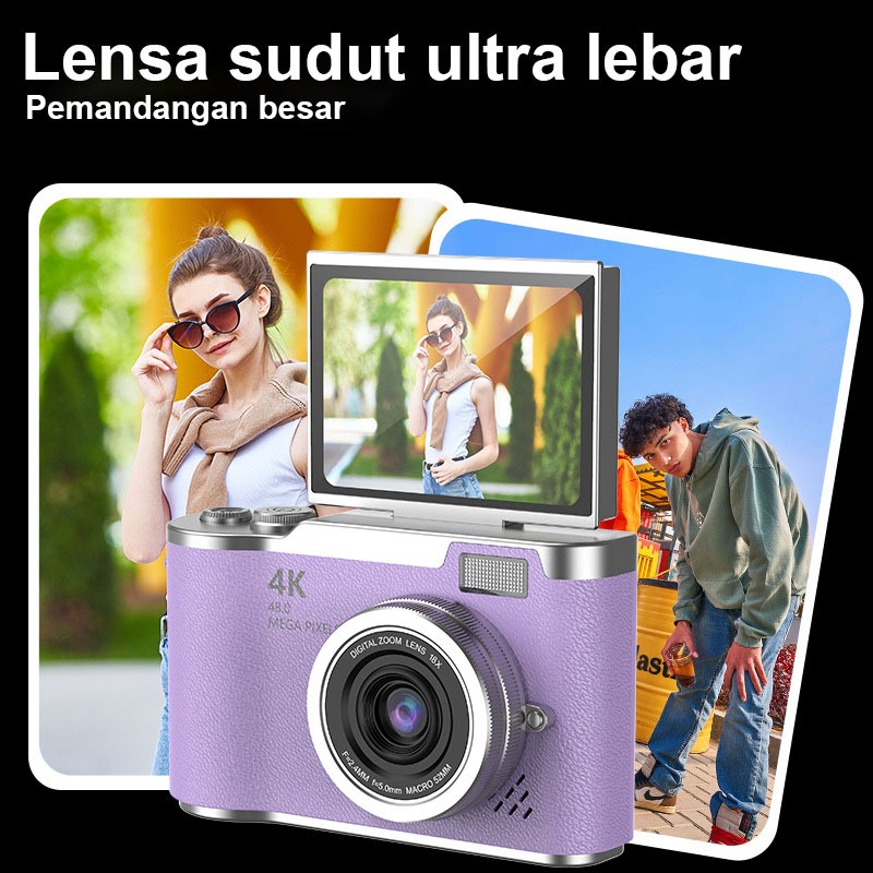 【】T-JERZEN Kamera Digital 4K HD 48 Juta Piksel Dengan Flash, Layar Flip 180°, Zoom 8X, Mamera Foto Mmini,Selfie, Kepala