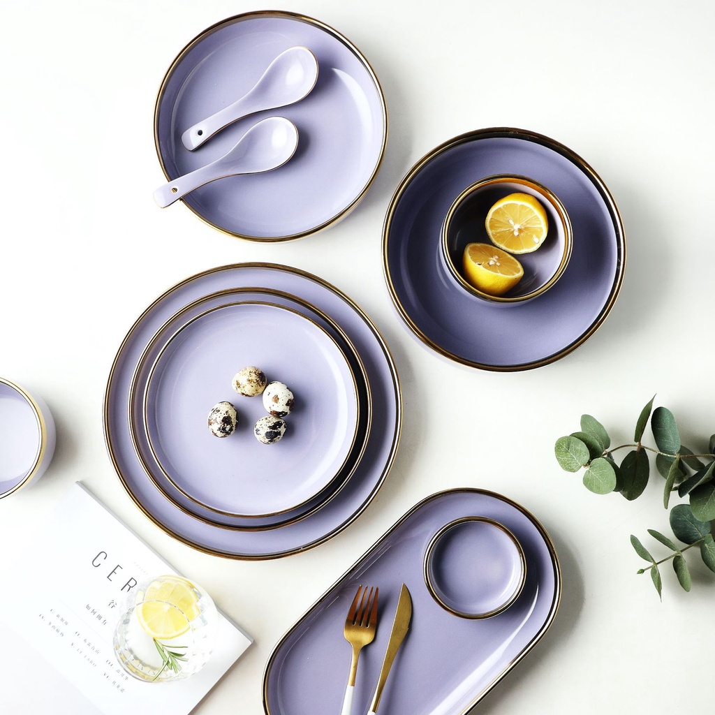 Piring Makan Keramik Ungu Lilac Gold / Piring Ungu Keramik List Gold / Mangkuk Keramik Ungu Gold Elegan / Piring Keramik