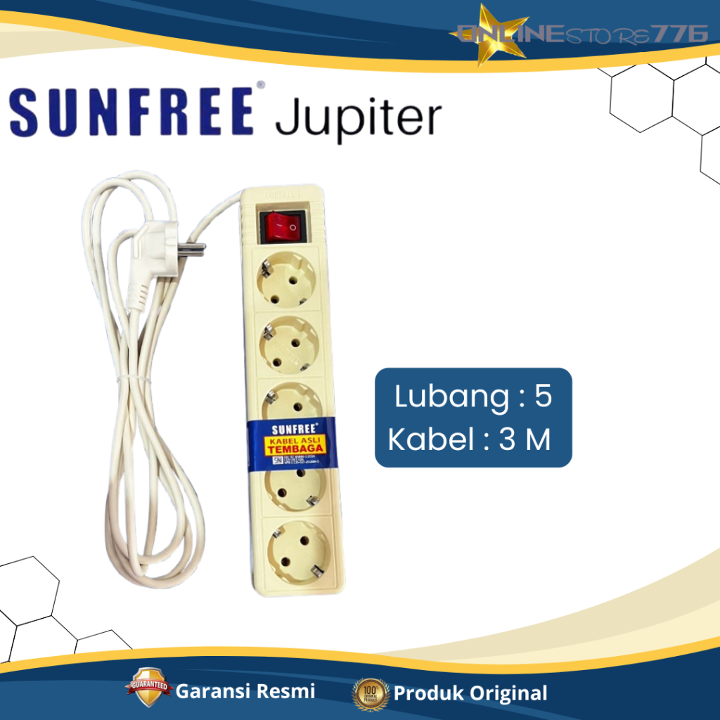 Stop Kontak Arde Sunfree Jupiter 3/4/5 Lubang Panjang Kabel 1,5 Meter / 3 Meter / 5 Meter Terminal Saklar On Off