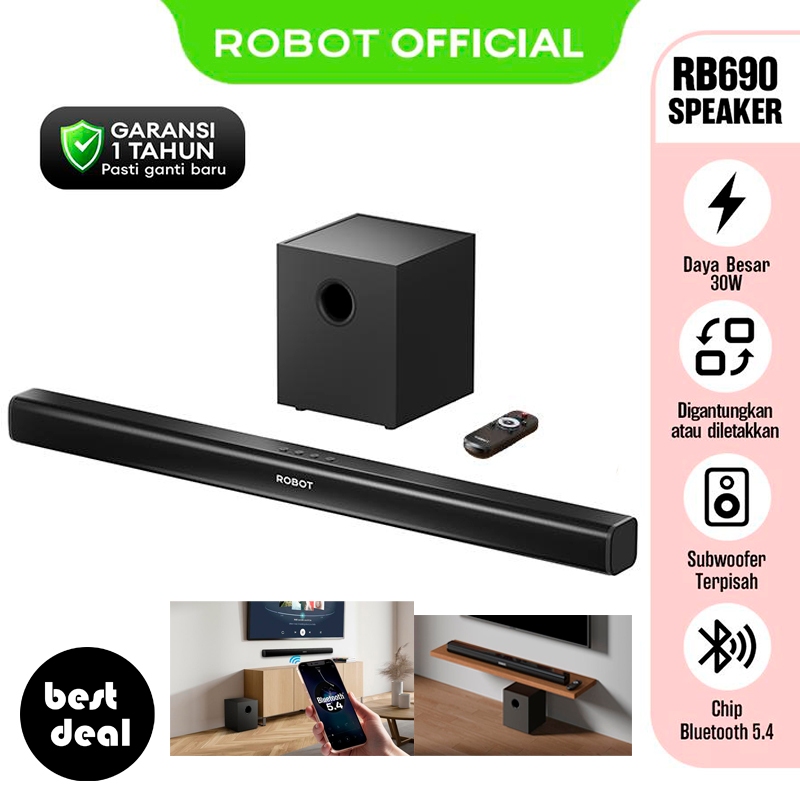 ROBOT RB690 Soundbar Speaker + Subwoofer Home Theater 30W Bluetooth 5.4 TV PC Aux 3.5mm Coaxial Micro SD - Garansi Resmi