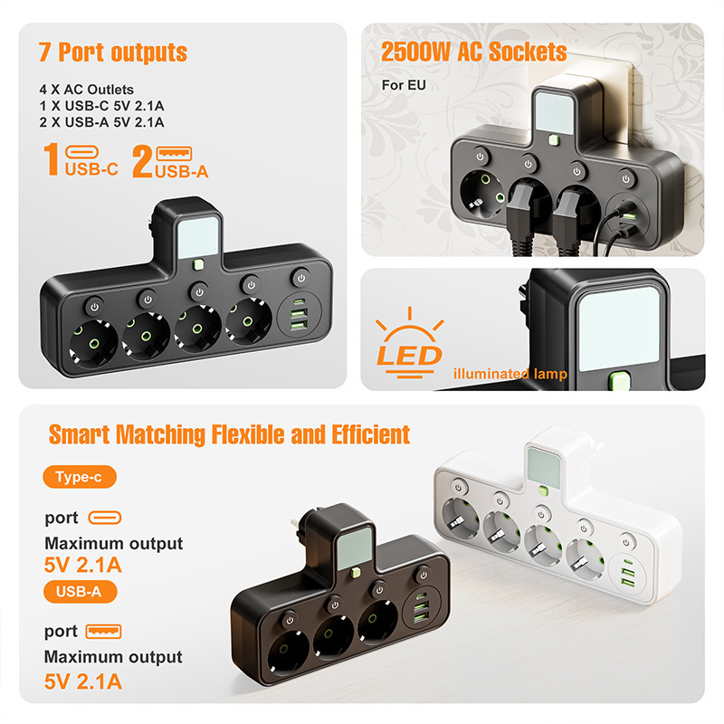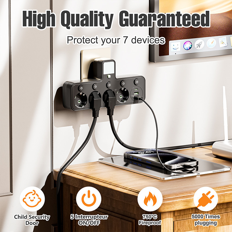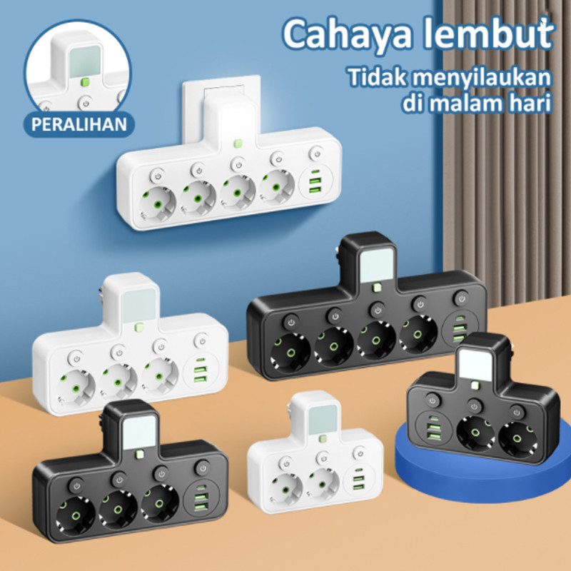 Stop Kontak Multi 4 Lubang + 2 USB 1 Type-C - Power Strip Expander dengan EU Plug, Anti Surge untuk Home Office