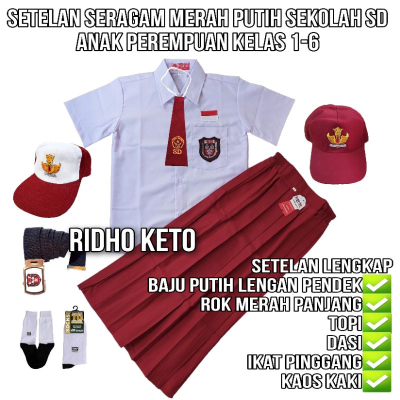 setelan seragam sekolah sd merah putih perempuan baju putih lengan pendek rok merah panjang kelas 1-6
