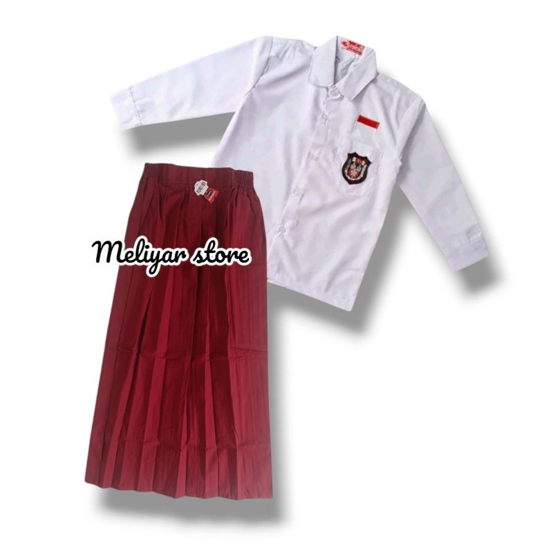 Set Lengkap Seragam Sekolah SD Merah Putih Perempuan Lengan Panjang Rok rempel Panjang+Hijab Kelas 1-6 sd