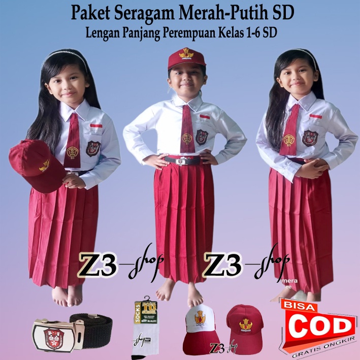 Paket lengkap setelan seragam sekolah SD merah putih perempuan lengan panjang rok merah panjang 1-6 SD