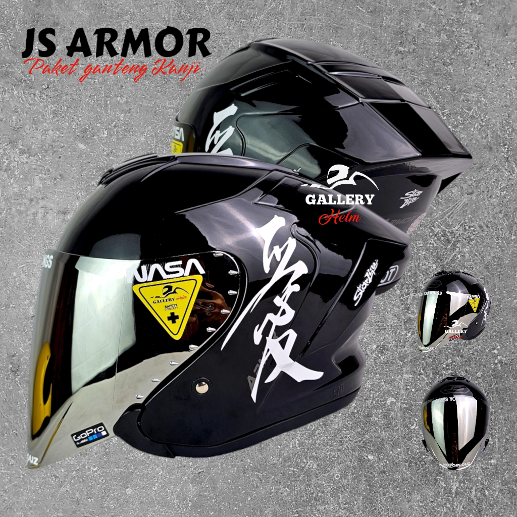 Helm js Armor Carbon Paket Ganteng Kanji | Visor Iridium - Half Face SNI