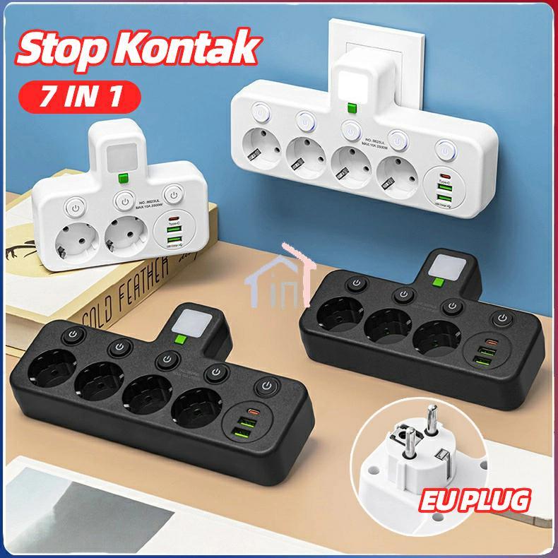 【】 7 in 1(USB Lubang 3/4)Stop Kontak Multi Outlets Expander with Tipe C , Kontrol Sakelar Independen,EU Plug Power Strip