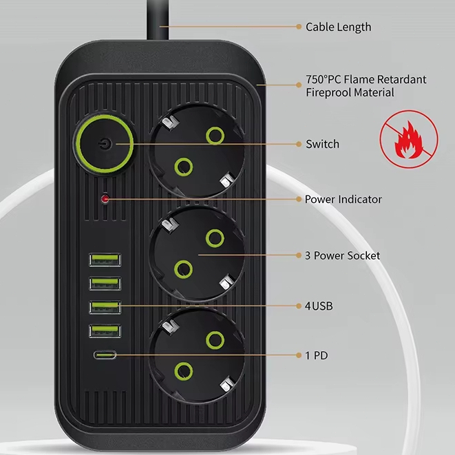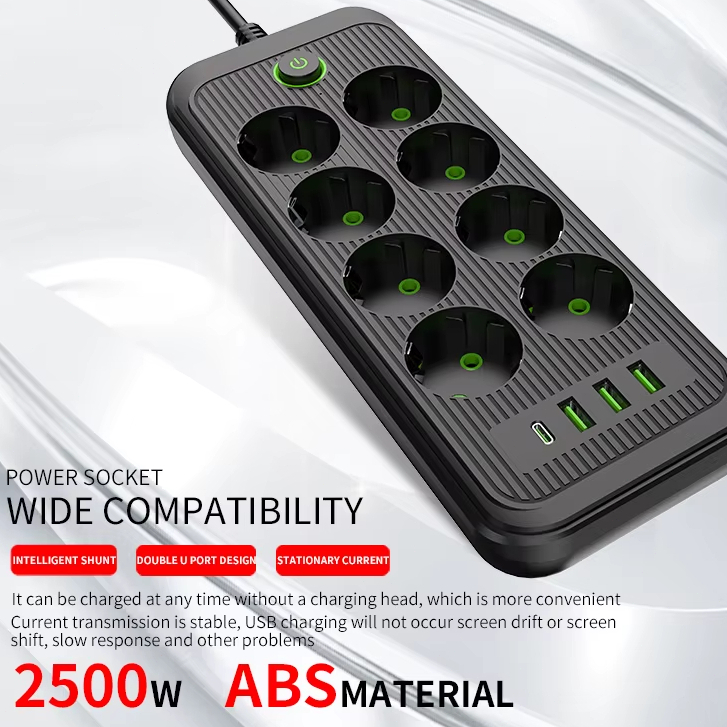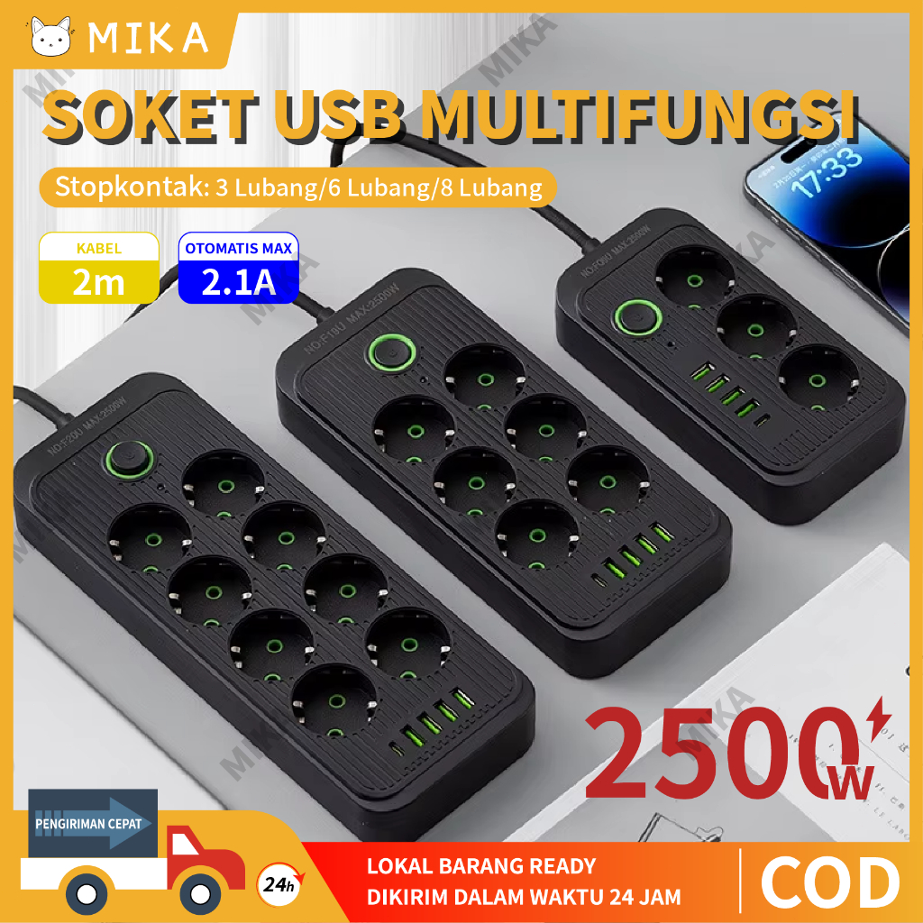 【Mika Mall】2500W Stop Kontak USB Kabel Serbaa Multia Panjang 2M Original Power Socket 8 Colokan+ 1 Type-C + 4 USB