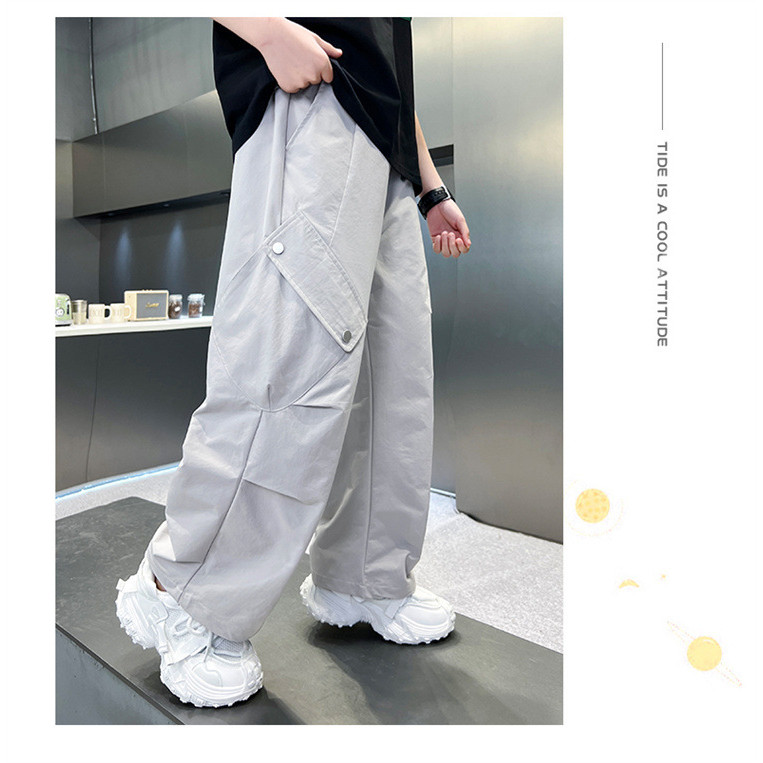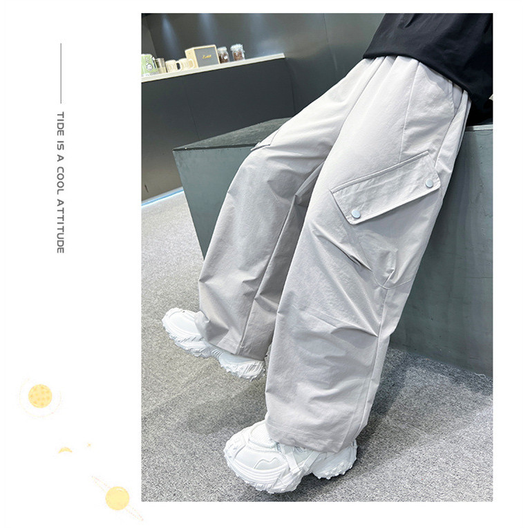 Celana vintage gombrong Kids Casual Loose Straight Drawstring Cargo Pants for Boys Retro Trackpants Tapered Cargo Trousers Child Coffee Black Cargopants
