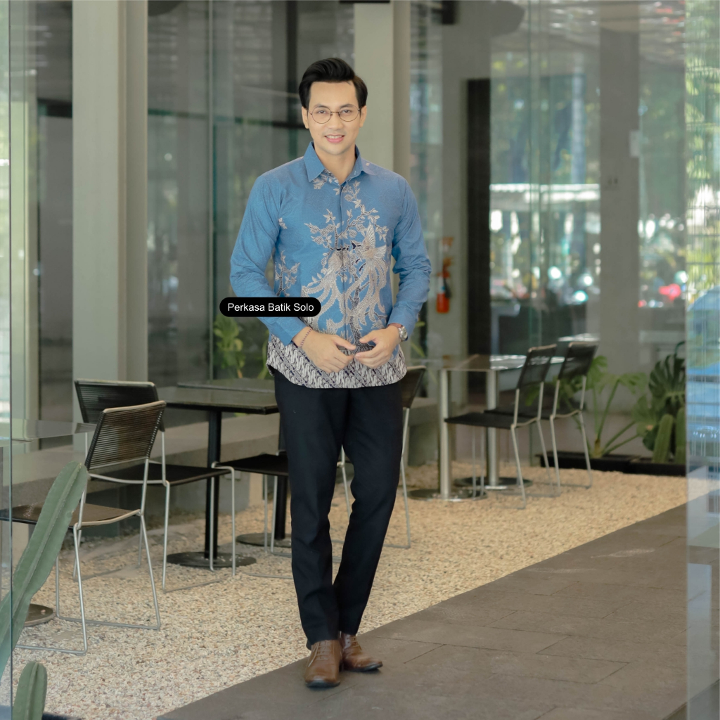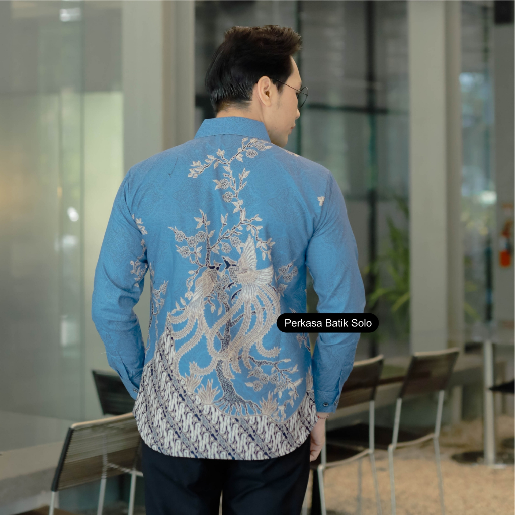 PERKASA BATIK Motif Baswara Biru Kemeja Batik Pria Lengan Panjang Furing Erro Warna Ice Blue Hem Kondangan Cowok