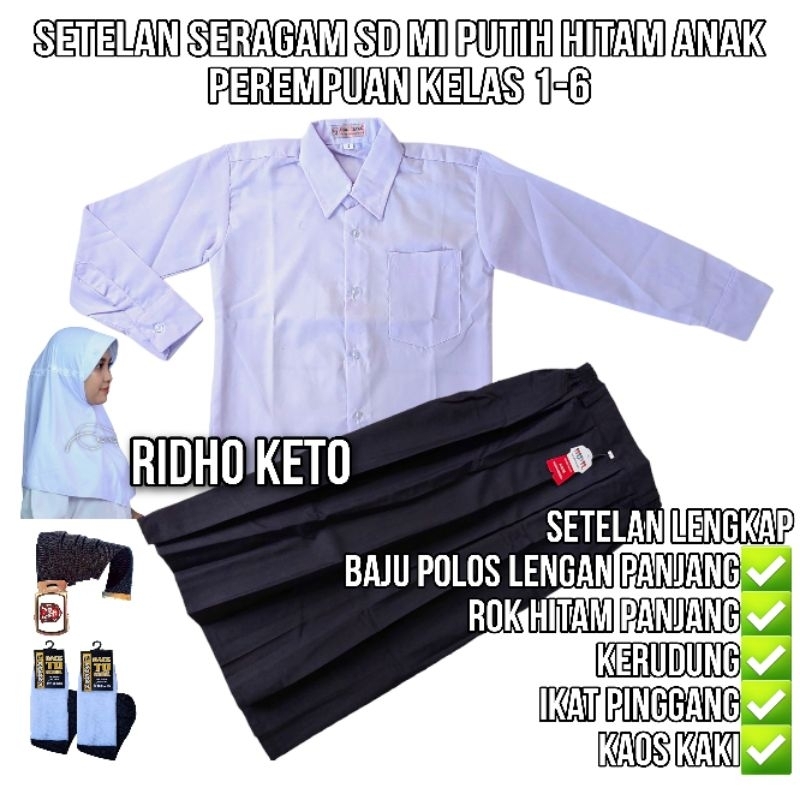 Setelan Seragam Sekolah SD MI Putih Hitam anak Perempuan baju putih lengan panjang rok hitam Panjang Kelas 1-6
