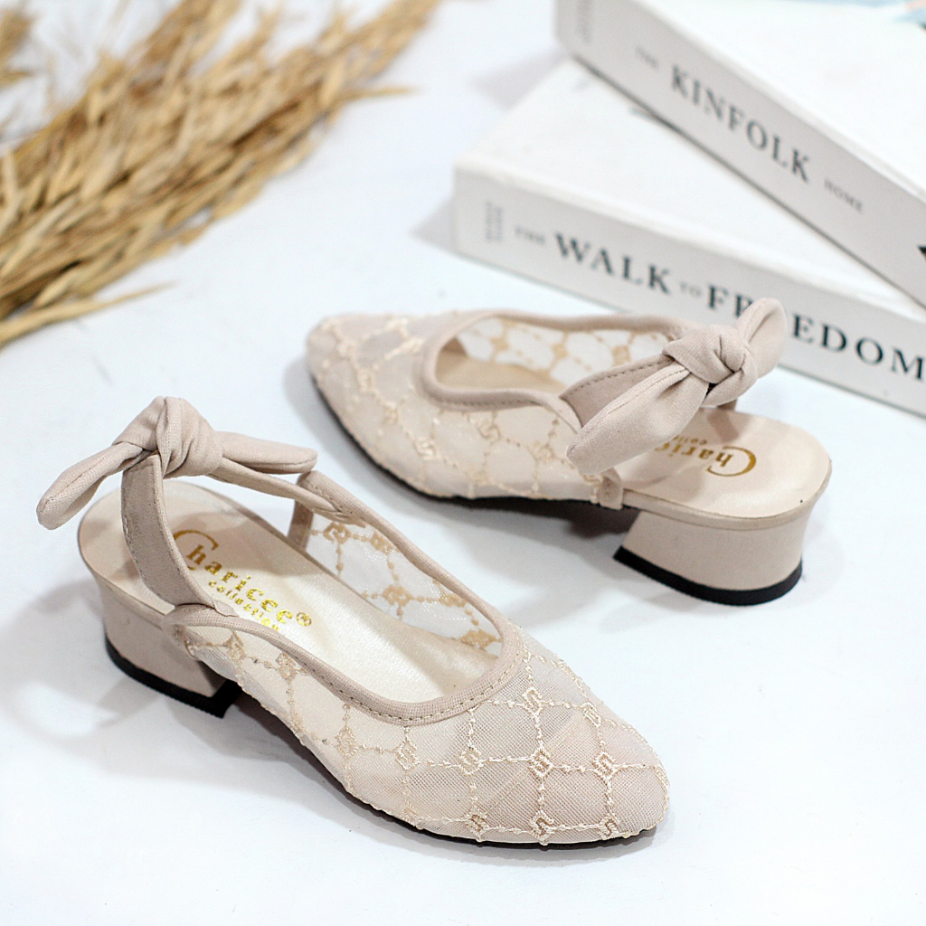 Sepatu Sandal Pesta Anak Perempuan Hak Tahu 3 cm Brukat Jala Selop Motif Pita