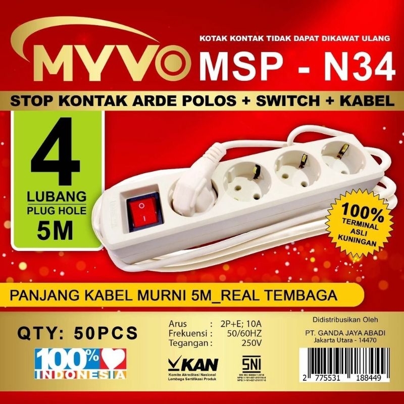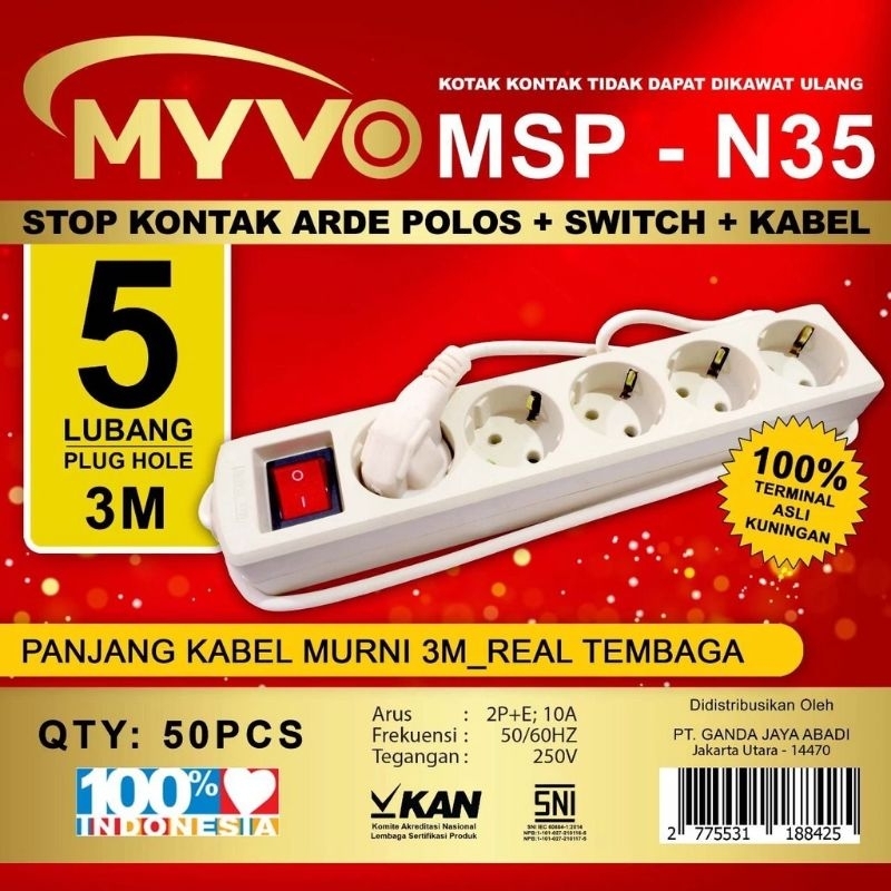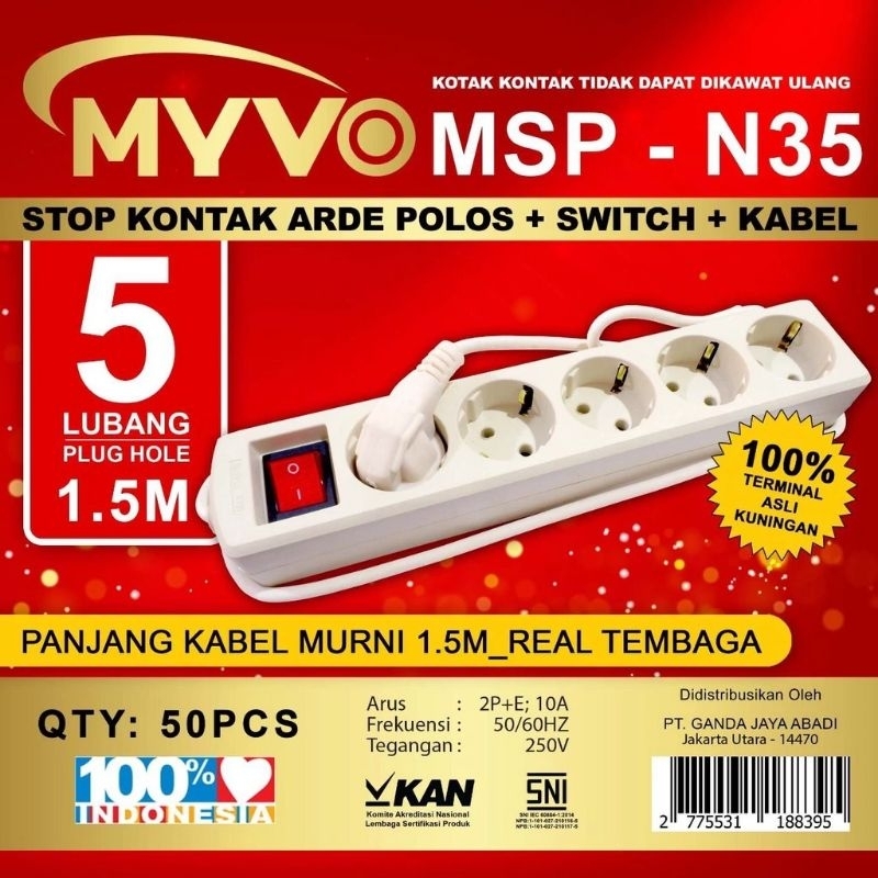 STOP KONTAK KABEL 1,5m 3m 5m 2 - 3 - 4 - 5 lubang MYVO SNI ORIGINAL