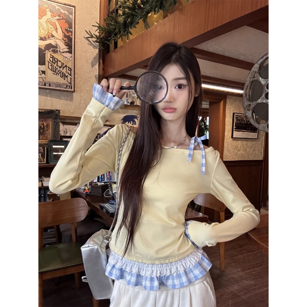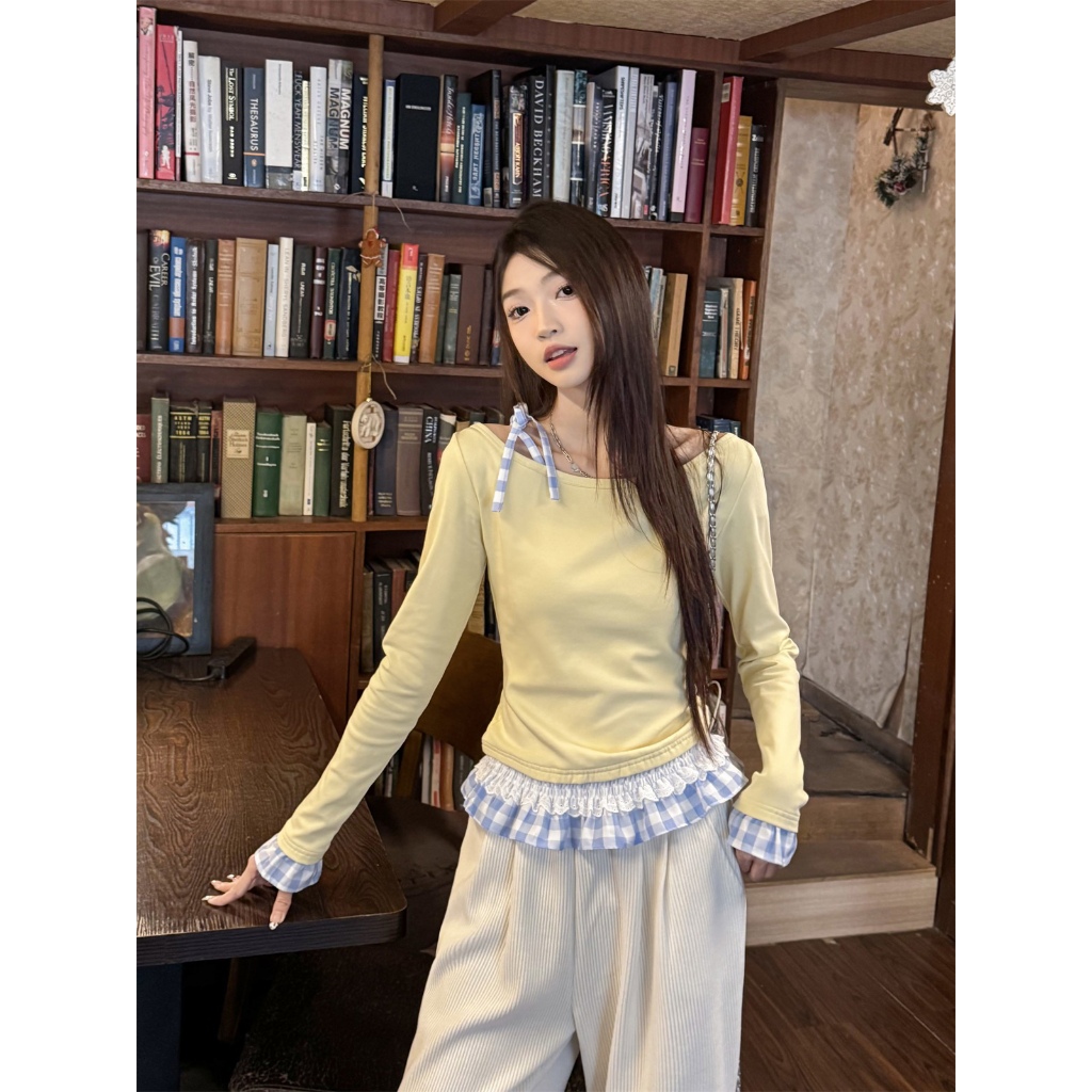 Soso susu kuning palsu dua bagian bahu langsung lengan pendek t-shirt musim panas desain korea baru perasaan minimalis t