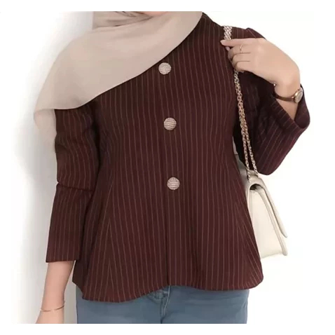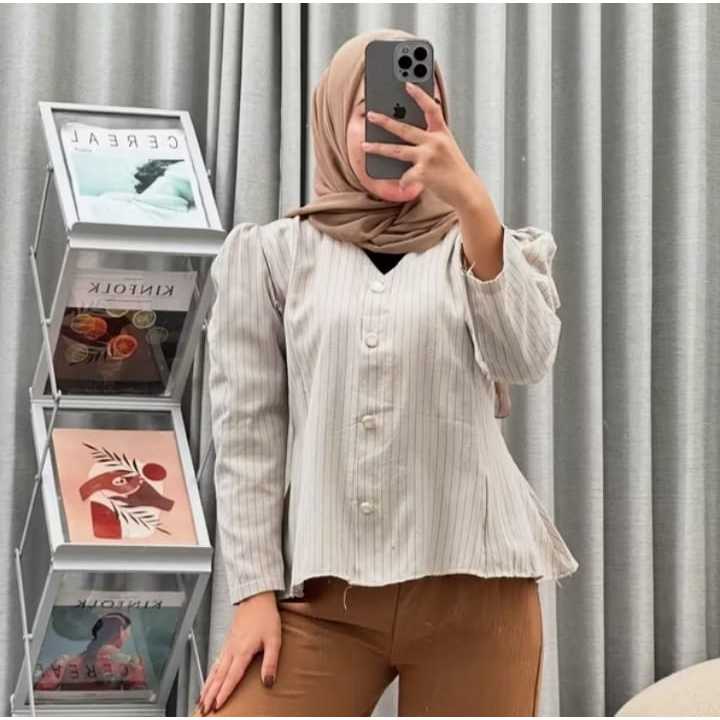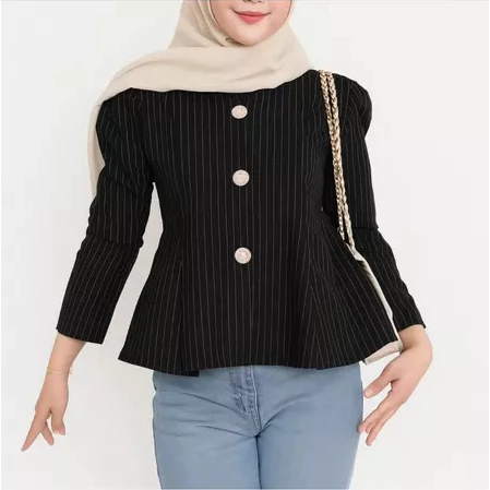 ARIKA Blouse Stripe Atasan Peplum Wanita Salur Lengan Puff Fit Body Fitted