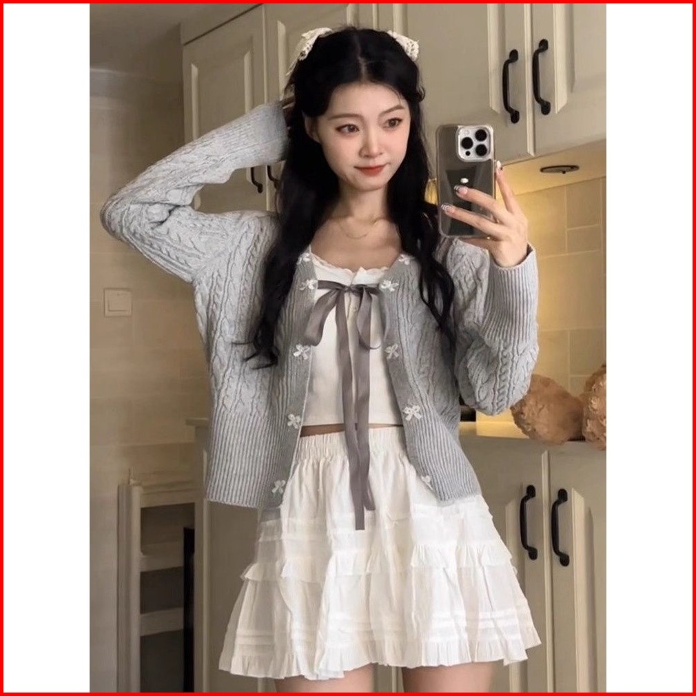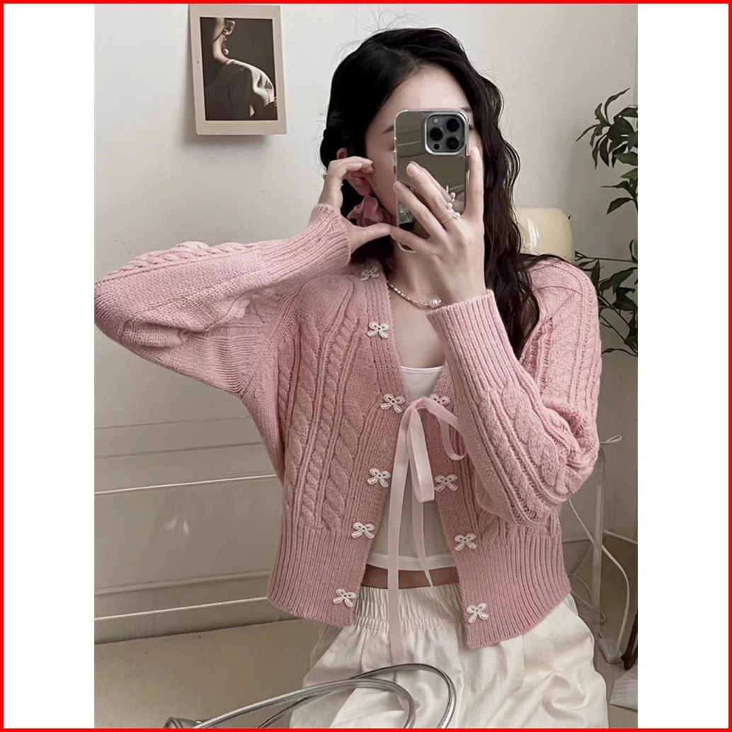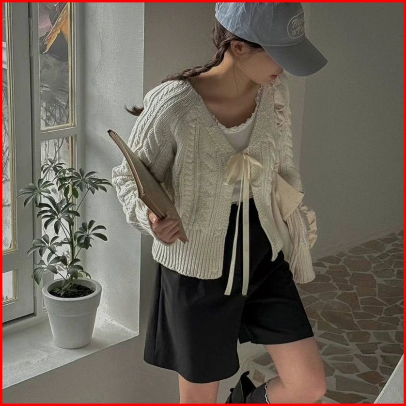 Kardigan Rajutan Kabel Leher V Simpul Pita Atasan Lengan Panjang Berenda Yang Longgar Dan Anggun